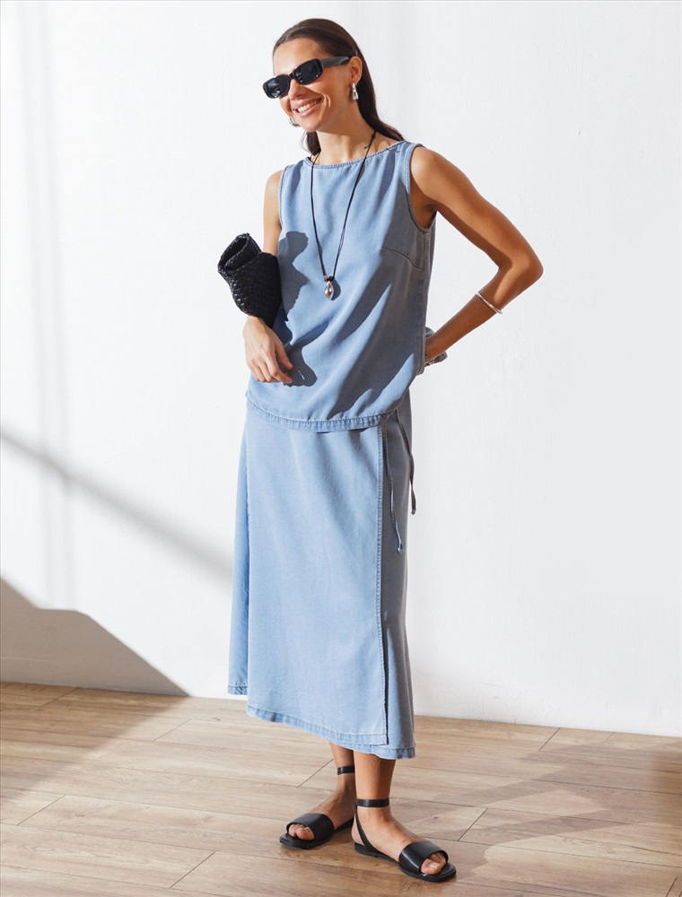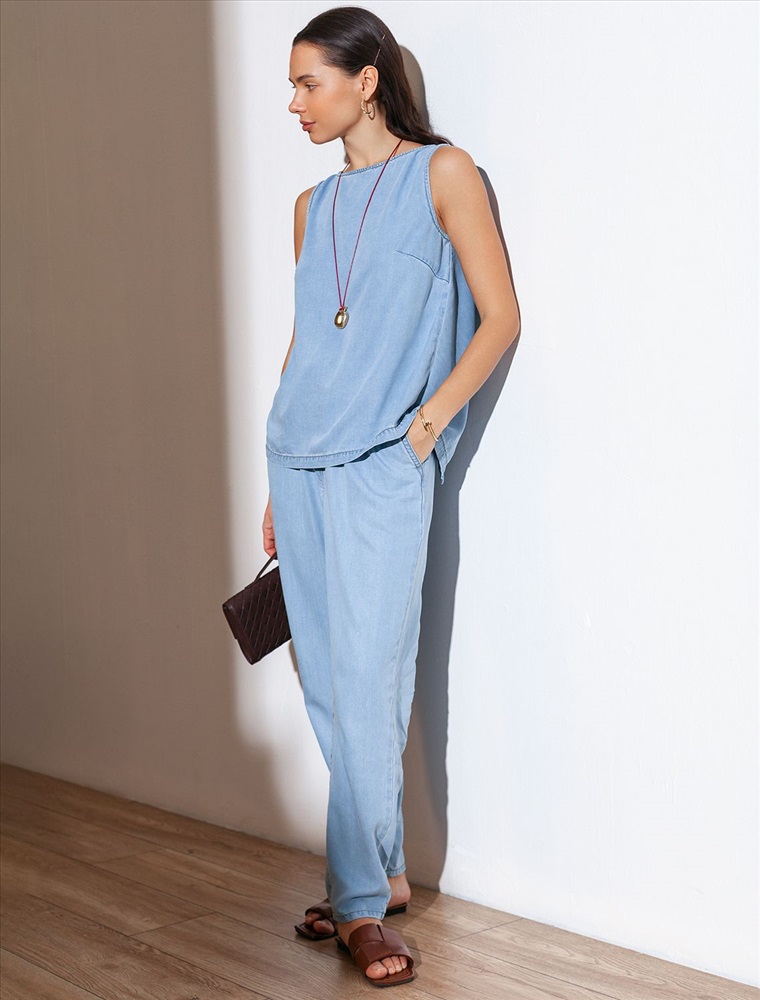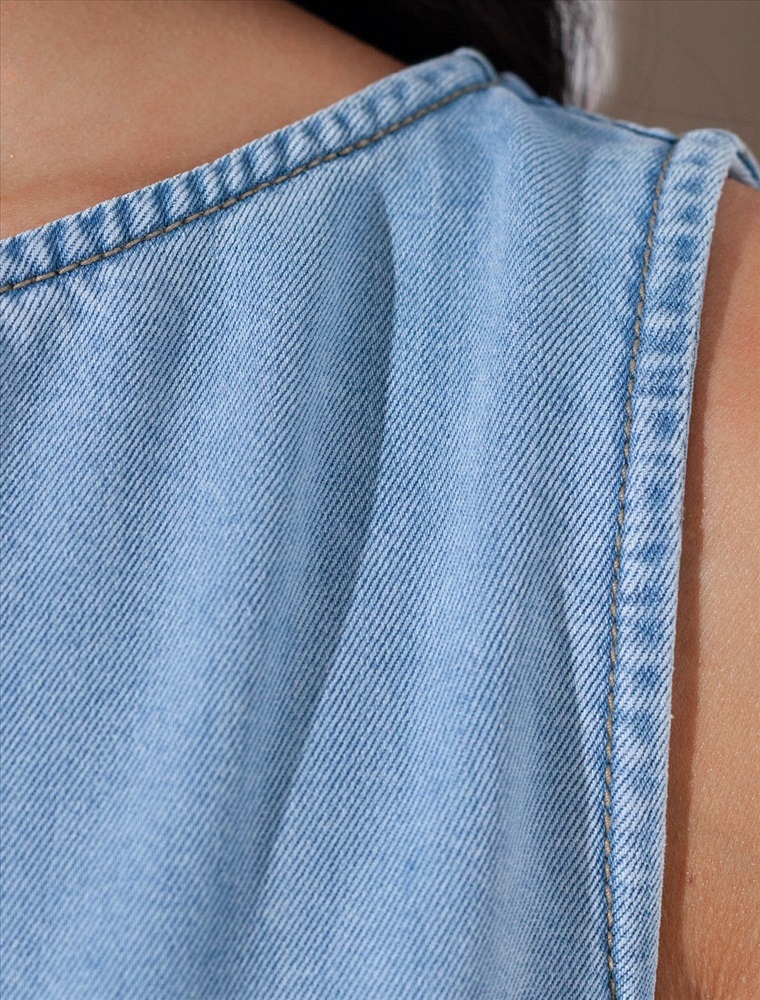 Плотность: 7,8 OZ Элегантный топ без рукавов плотностью 7,8 OZ светло-голубого цвета станет идеальным выбором для теплого времени года или многослойных ансамблей. Вырез лодочка придает топу утонченность, а асимметричный разрез на спине добавляет необычности и легкой дерзости. Аккуратная контрастная вышивка на спине служит дополнительным украшением и делает изделие более уникальным. Простой прямой крой топа в сочетании с интересными деталями создает стильную и в то же время комфортную вещь. Особенность топа - состав ткани, сочетающая прочность и мягкость лиоцелла с вискозой, что делает её невероятно комфортной, дышащей, устойчивой к сминанию и идеально подходящей для чувствительной кожи. Благодаря нежным тактильтным ощущениям, будто шелк, от которого ощущается приятная прохлада, повседневный топ подойдет на жаркое лето. Топ подойдет для любительниц базовой одежды, которые хотят деликатно повысить градус своего стиля. Рекомендуем сочетать с артикулами: D56.127, D54.239, D54.257 Комментарии к товару