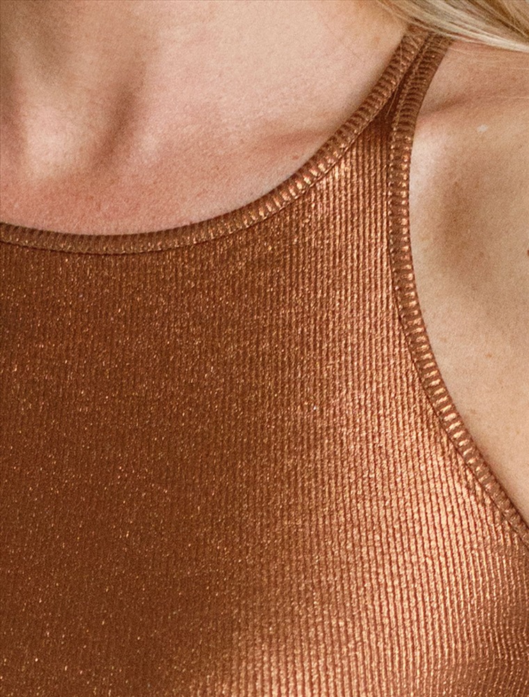 Эффектный топ кофейного цвета из мягкого хлопка с эластаном представлен в стильном исполнении с матовым бронзовым покрытием металлик с серебристыми вкраплениями. Мелкий рубчик визуально вытягивает силуэт и подчеркивает фигуру, делая образ более стройным и аккуратным. Круглый ворот и суженные лямки акцентируют внимание на линии ключиц, делая образ утонченным и изысканным, Благодаря деликатному блеску топ подходит для тех, кто ценит утонченность и стремится добавить в образ немного сияния без перебора - это отличный вариант топа для любительниц минимализма.