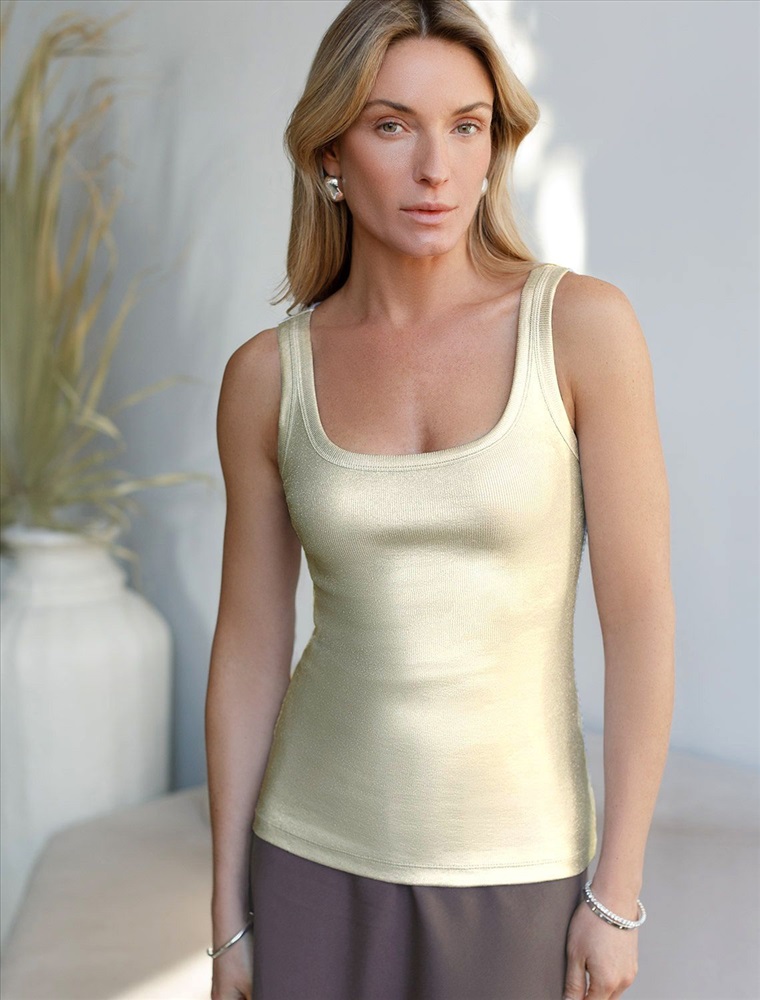 Эффектный топ золотистого цвета с широкими лямками — идеальный выбор для создания стильного образа на каждый день или вечерний выход. Ткань в мелкий рубчик визуально вытягивает силуэт, правильный крой подходит на любую фигуру, комфортно садится на большие размеры, не сковывая движений. Изысканный матовый блеск металлик добавляет современный акцент даже самому простому образу.
