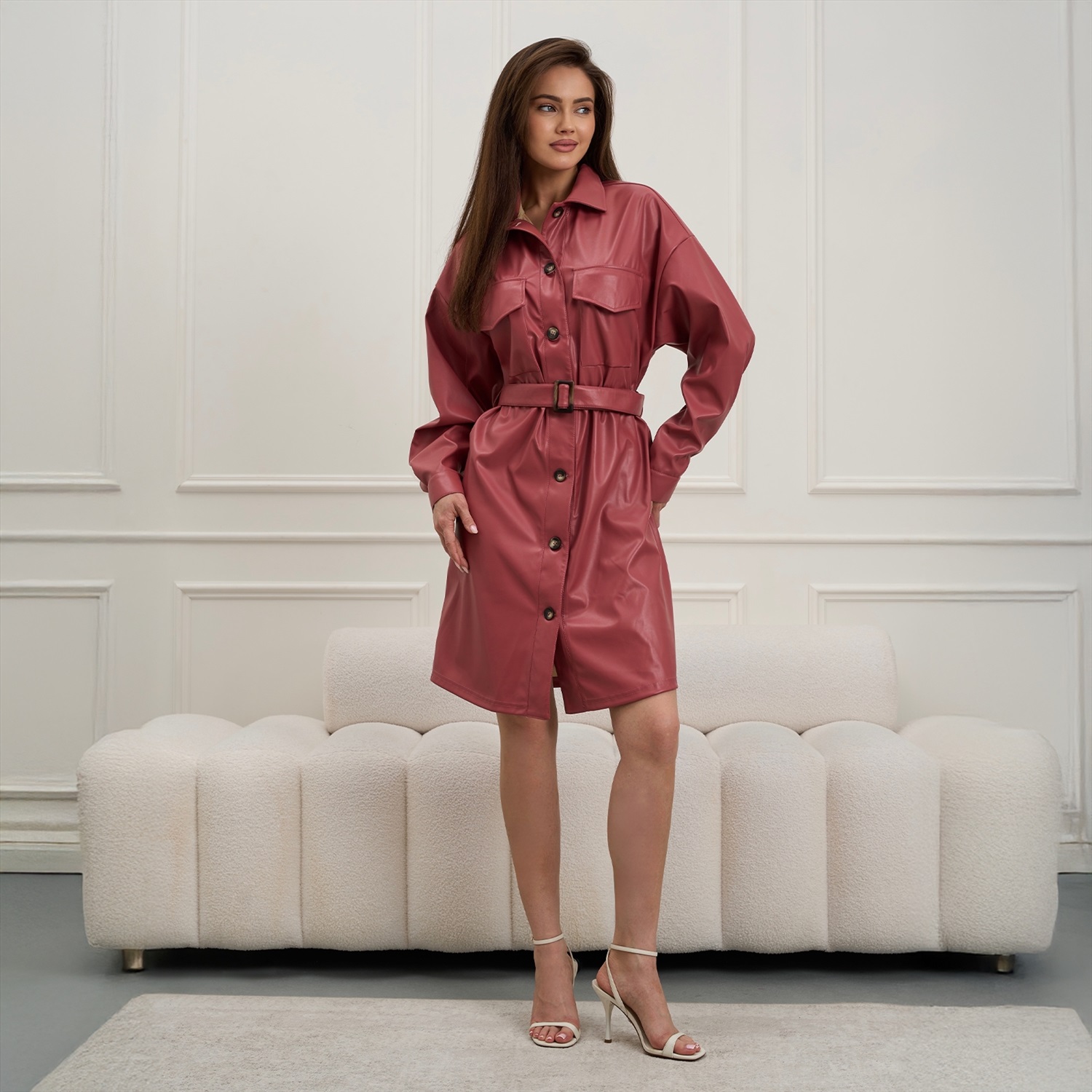 Женский тренч с поясом.Материал: Palermo - современная высокотехнологичная ткань. Имеет трикотажную основу, с имитацией кожи на лицевой стороне. Мягкое, пластичное, и в тоже время очень плотное полотно, обладающее теплоизоляционными свойствами.Состав: основной ткани: 90% Polyester, 10% Elastane (покрытие лицевой стороны - 100% Polyurethane).