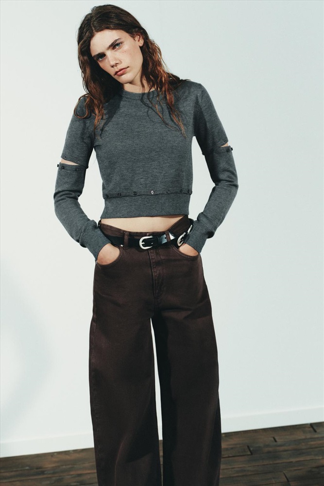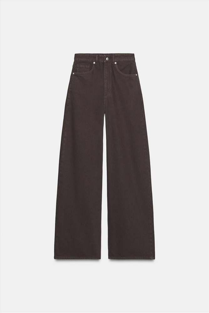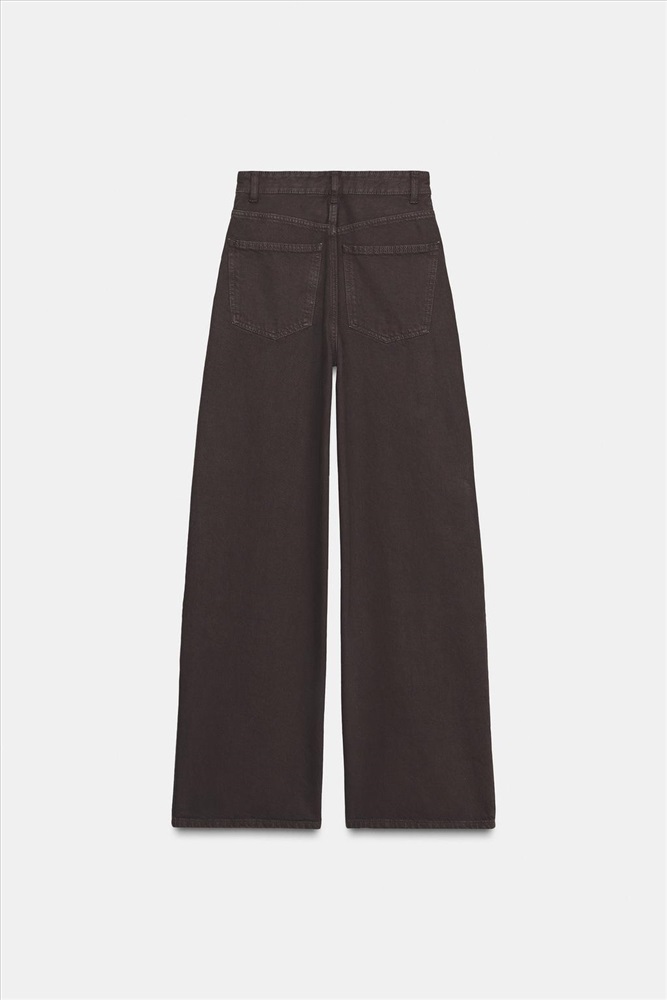 High-waist jeans with five pockets. Extra-long wide leg. Zip fly and metal button fastening.