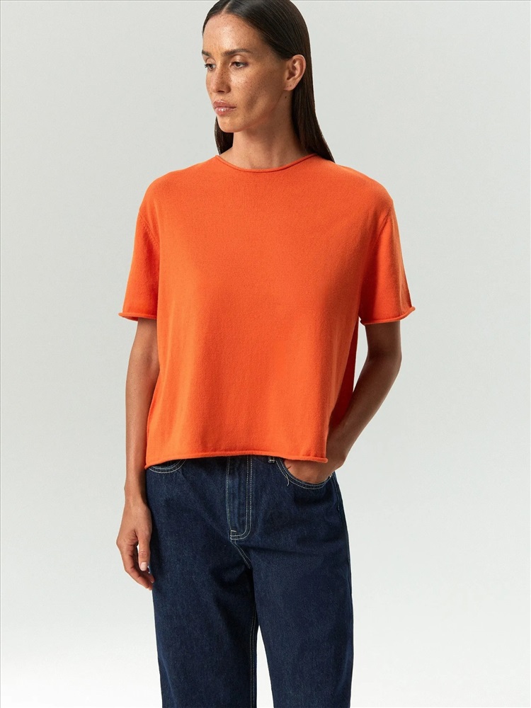 Футболка, которая может заменить тонкий джемпер в гардеробе. Выполнена из натурального хлопка и очень комфортна к телу. Модный апельсиновый цвет поднимает настроение. Закатанный край и акцентный шов на спинке освежают образ. Укороченный фасон отлично смотрится с джинсами, брюками, юбками высокой и завышенной посадки. Незаменимая вещь на весенне-летний сезон.