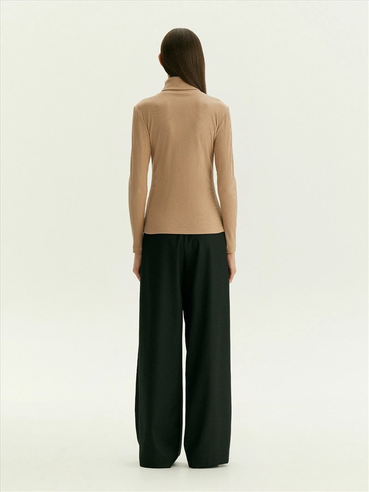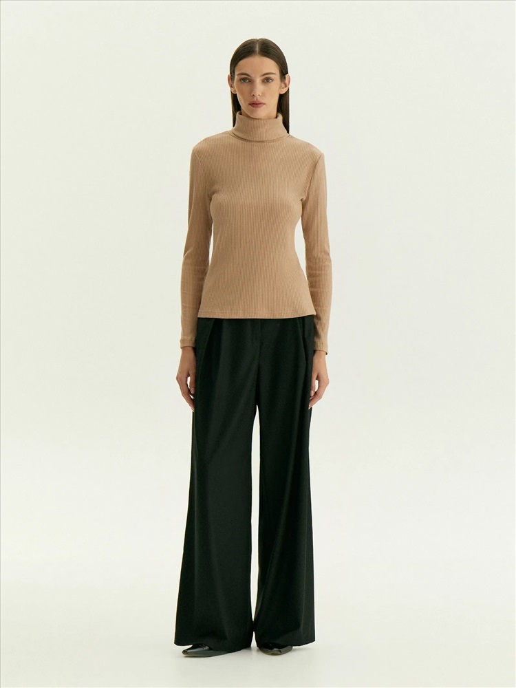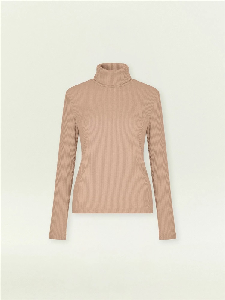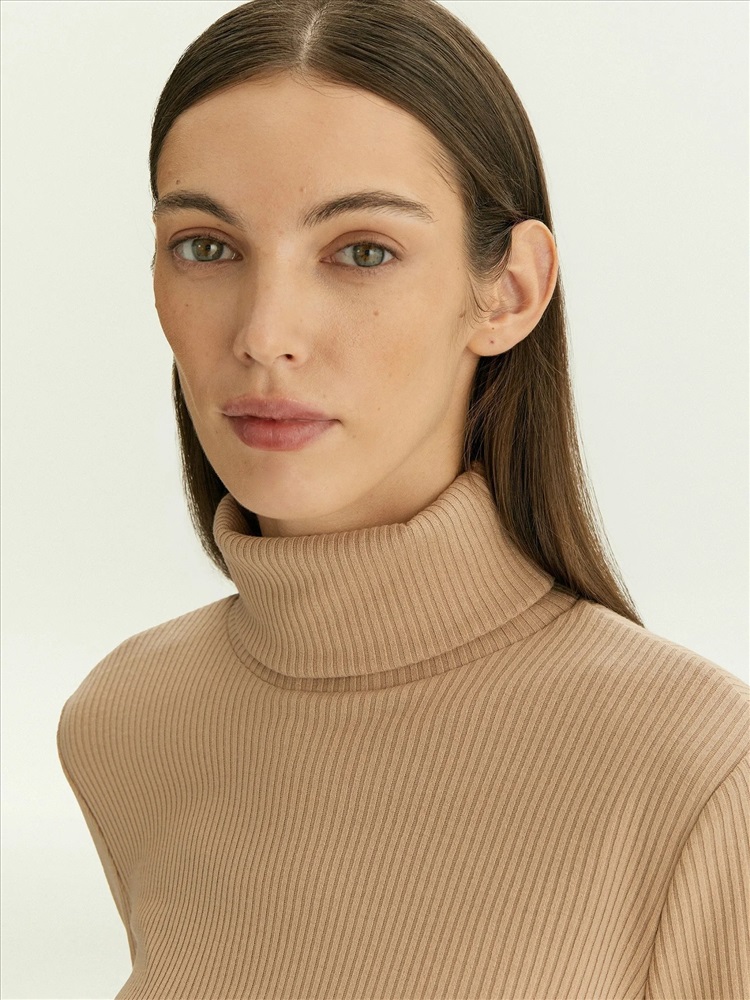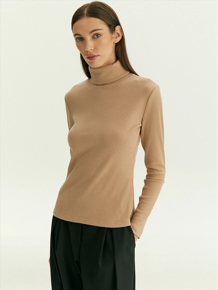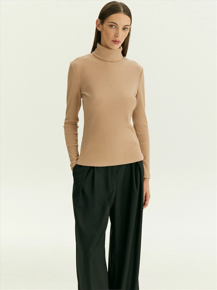 Бежевая трикотажная водолазка из мягкого эластичного материала на основе вискозы. Модель с длинным рукавом и воротником «гольф» облегает фигуру, хорошо держит форму. Сочетается с любым базовым низом.