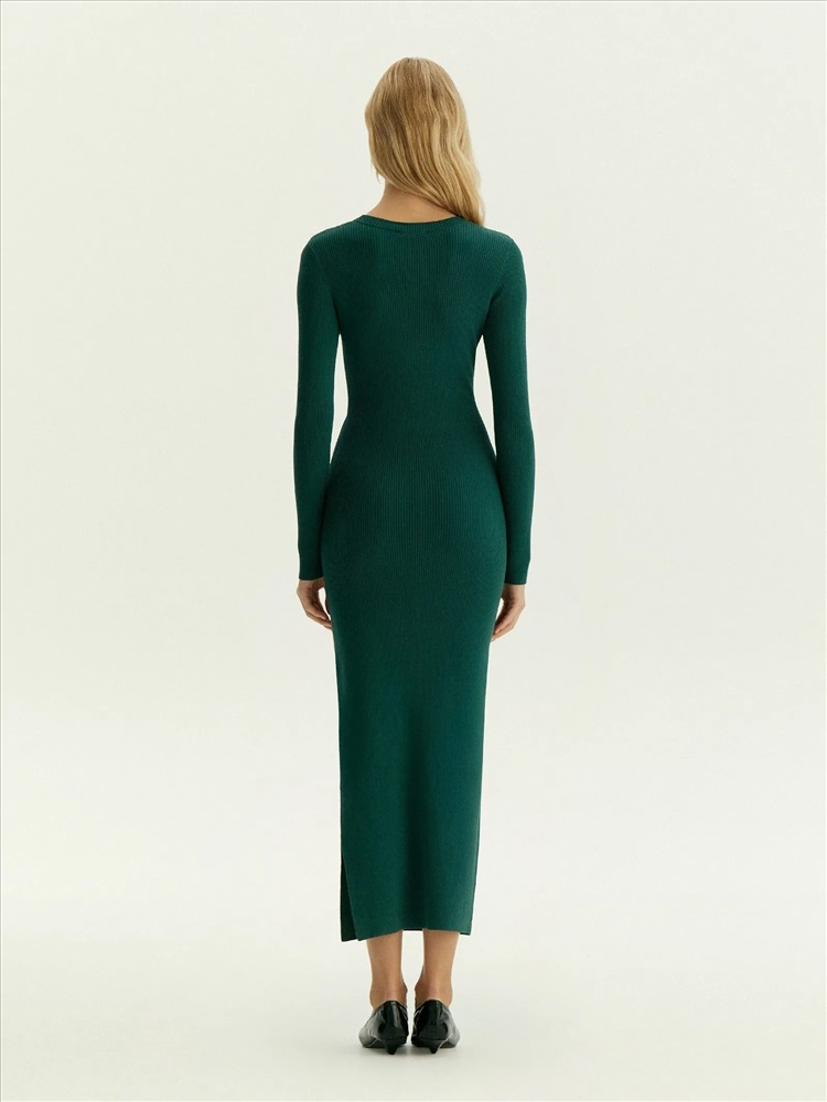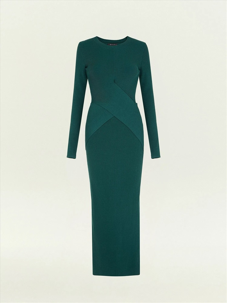Вязаное платье на каждый день в зелёном цвете. Идеальный вариант для plus size и не только, формирует эффектный силуэт с акцентированной талией. Приталенная модель миди с имитацией запаха имеет неглубокий круглый вырез, длинные облегающие рукава и небольшой разрез на юбке. Изделие выполнено из материала с высоким содержанием вискозы, без подкладки.