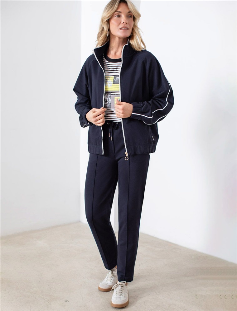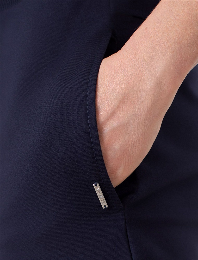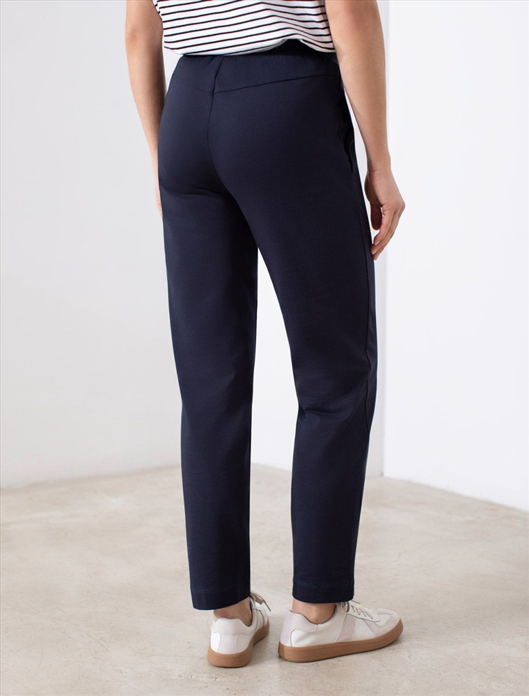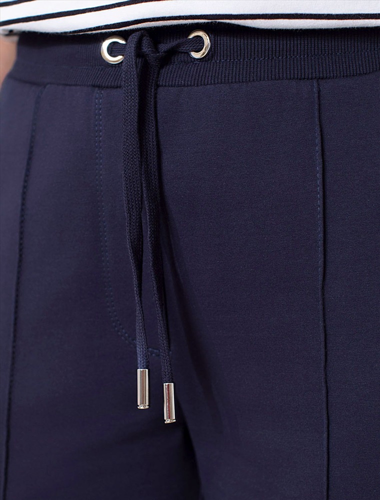 Брюки темно-синего цвета зауженного кроя выполнены из премиального футера-двухнитки. Лаконичный силуэт поддерживают застроченные стрелки, зрительно вытягивающие силуэт. Удобный пояс на резинке регулируется хлопковым шнурком с золотистой фурнитурой. Наличие эластана в составе изделия гарантирует комфорт и долговечность изделия. Эластичный материал хорошо пропускает воздух, позволяя телу дышать, и легко тянется, не ограничивая движения.