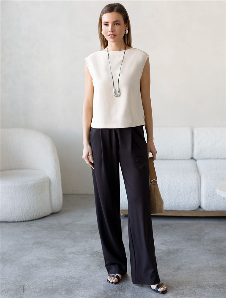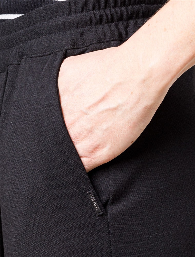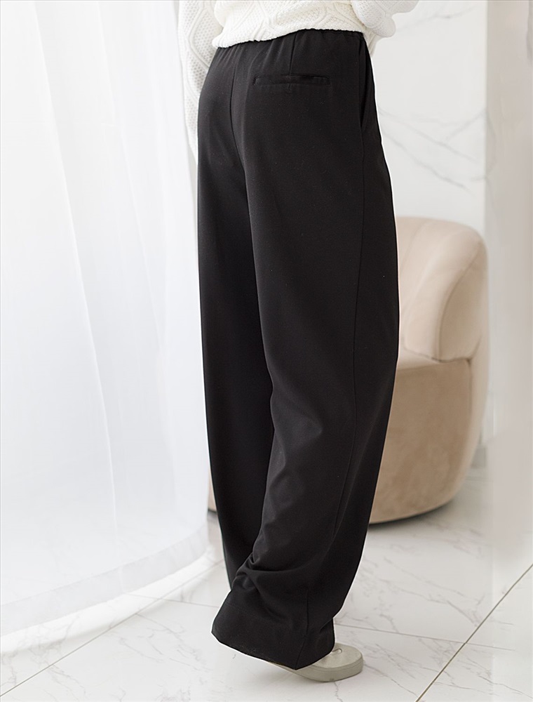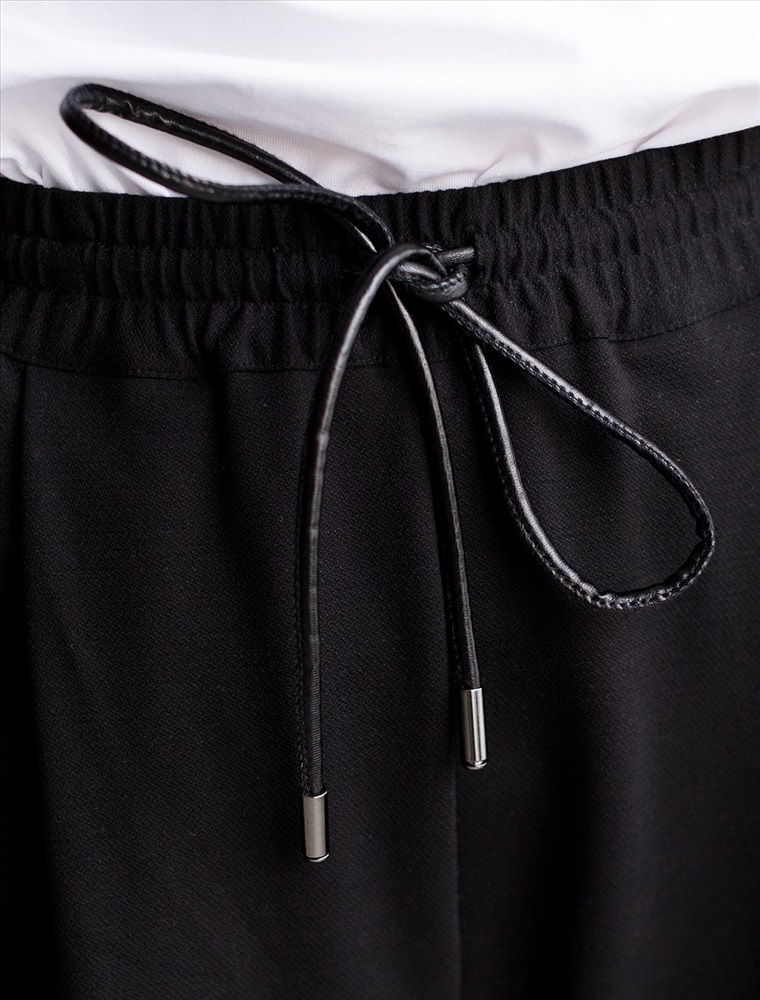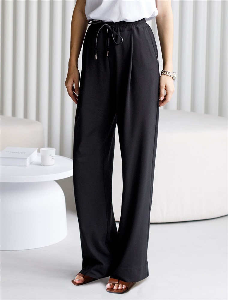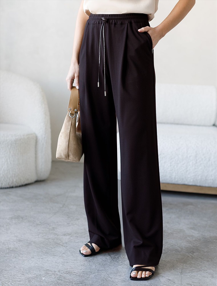 Свободные брюки из трикотажного костюмного полотна. Эластичный пояс на резинке с регулируемым шнурком из эко-кожи комфортно фиксирует изделие на талии. Модель дополнена двумя боковыми и задним карманами.