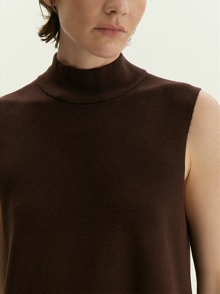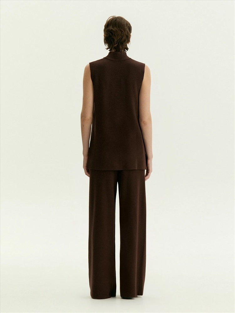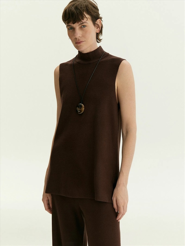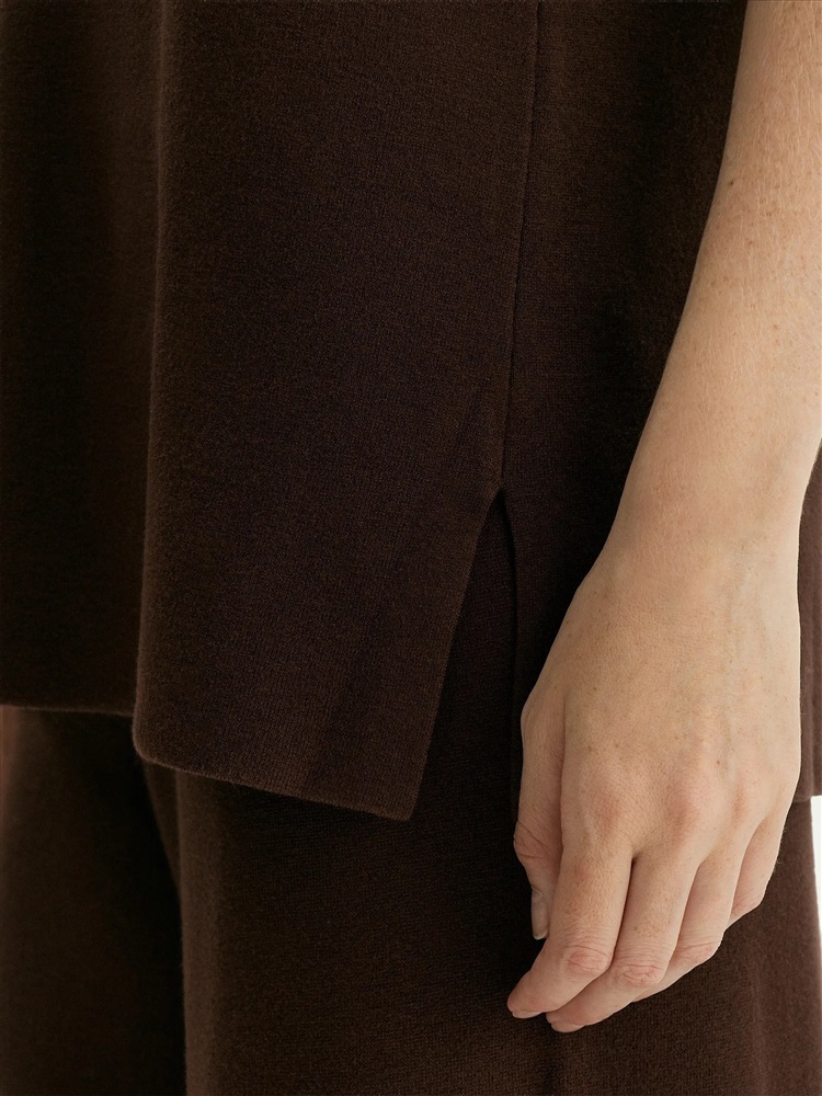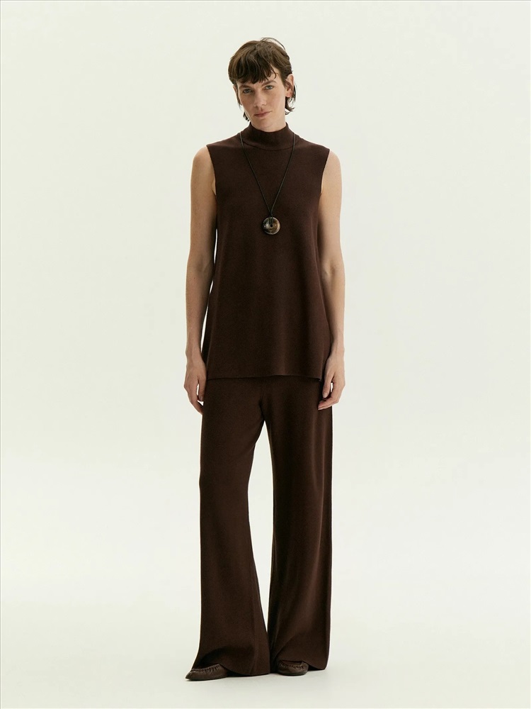 Трикотажный топ в шоколадном цвете — идеальный вариант на каждый день, который удобно носить соло и под жакеты. Незаменим в демисезонных и зимних капсулах. Удлинённая модель с высоким воротом, особенно в комплекте с брюками высокой посадки, защищает от холода все важные точки. Топ красиво садится по фигуре за счёт оптимального баланса между свободой и лёгким уклоном в приталенность; добавляет изящества повседневным аутфитам благодаря элегантному фасону. Мягкий трикотаж плотной вязки сделан из вискозы с эластаном. Топ сочетается с брюками из комплекта и любым другим базовым низом в гардеробе. Комплект с брюками станет любимым повседневным образом, который сочетает в себе максимальный комфорт и элегантность.