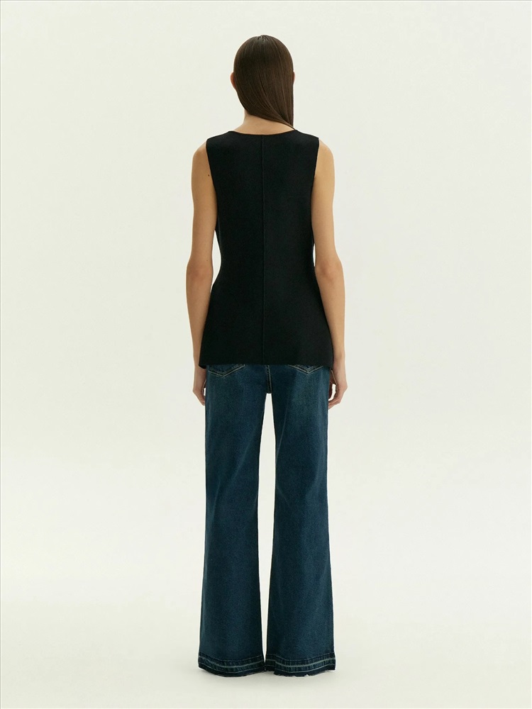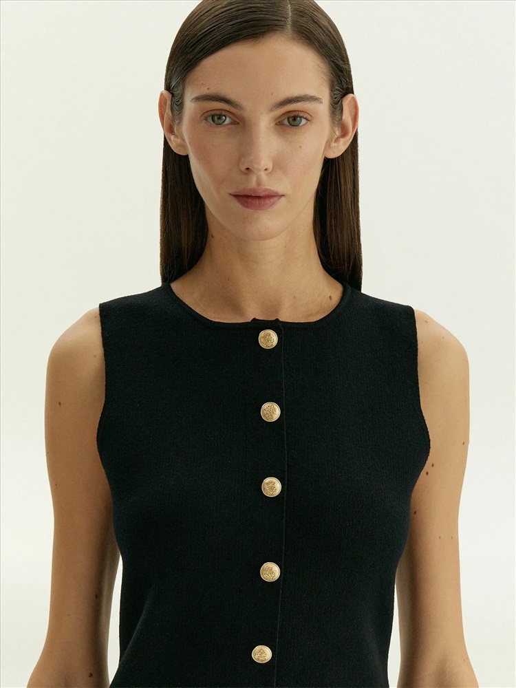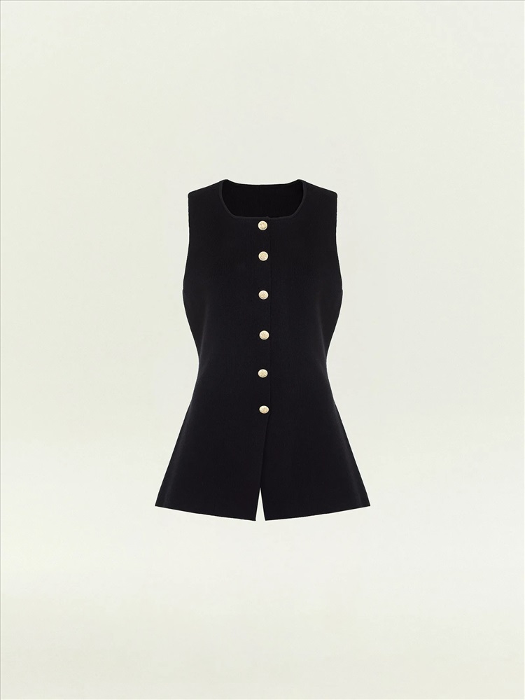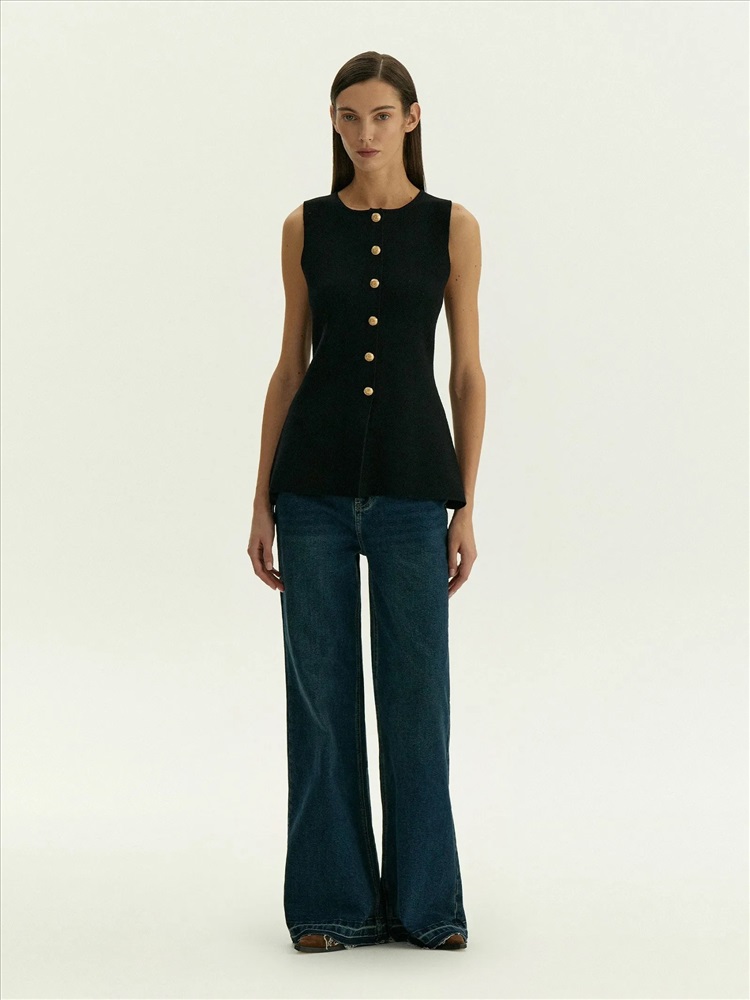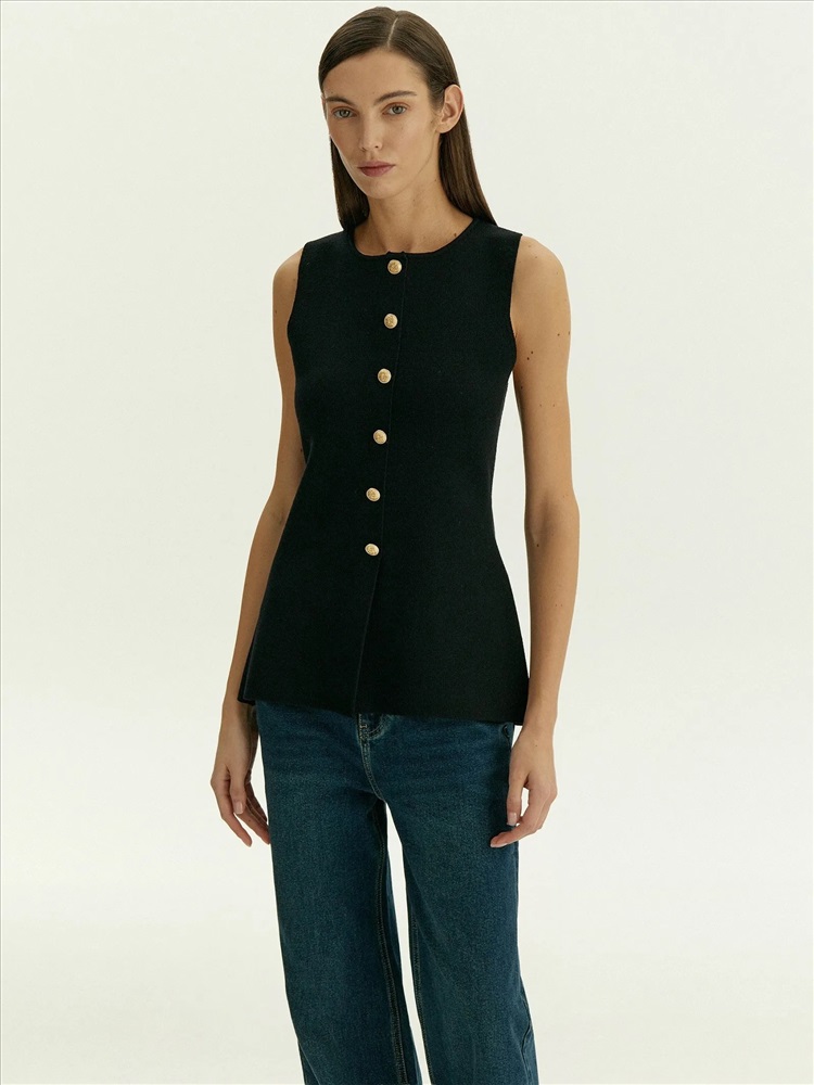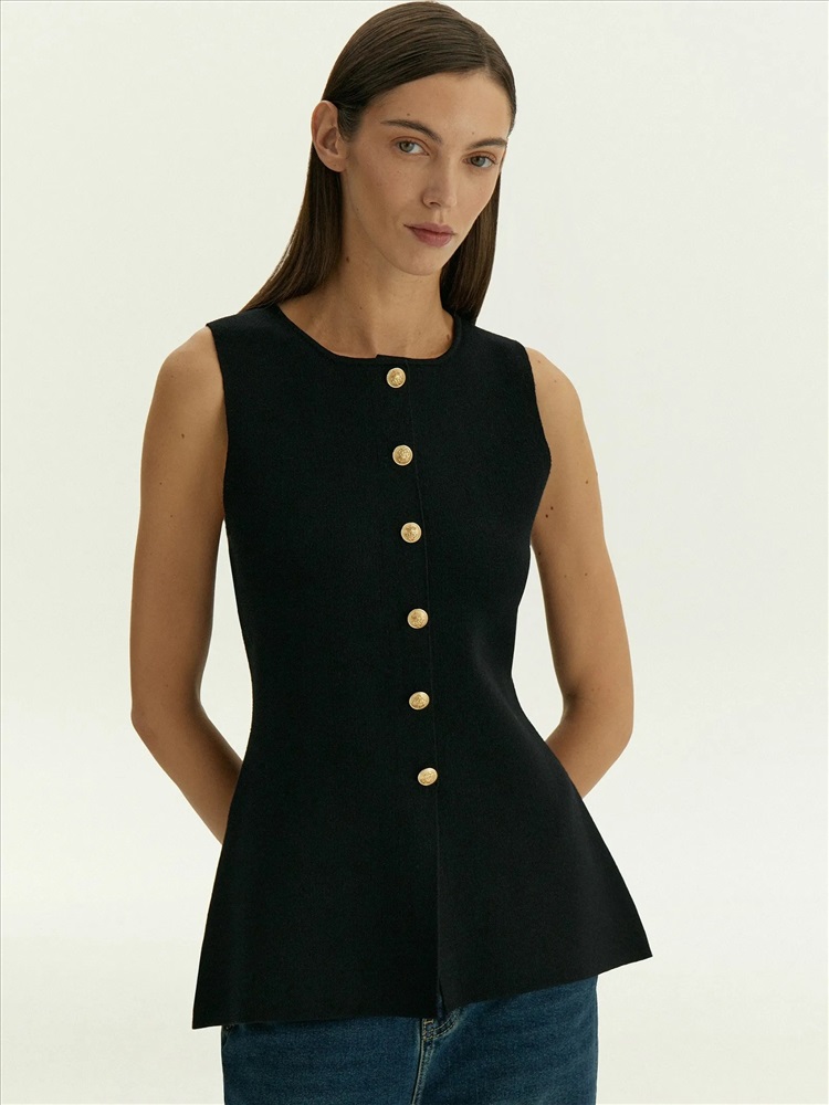 Чёрный топ для самых элегантных выходов. Одинаково хорош и на каждый день, и к особым случаям. Топ с имитацией жакета дополнен рядом декоративных, не расстегивающихся пуговиц. За счёт такого решения топ красиво смотрится на большой груди: пуговицы не будут расходиться. Плотный и в то же время комфортный трикотаж помогает держать грудь. Изящная приталенная модель безупречно садится по фигуре. Вырез уголком снизу дополнительно акцентирует контраст между талией и бёдрами. Материал высокого качества не вытягивается и не протирается в процессе носки. Топ может стать частью капсулы с платьем corvus.