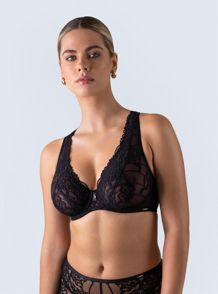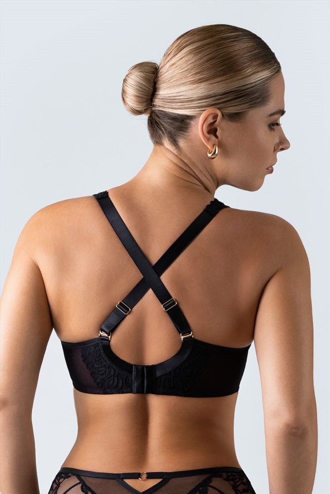 Бюстгальтер-бралетт из коллекции TruffleNoir выполнен на основе бюста Sublime с мягкими, шитыми из роскошного черного кружева чашками, продублированными сеткой цвета трюфеля, на косточках, с дополнительными боковыми поддержками. Пояс из черной сетки продублирован сеткой цвета трюфеля. Широкие бретели с подкладкой из мягкого пеноматериала регулируются по длине, не отстёгиваются. На спине застёжка на удлинитель, количество крючков в ряду застёжки увеличивается пропорционально размеру бюстгальтера, фурнитура металлическая цвета желтого золота. Бюстгальтер идеально сочетается с трусиками из коллекции TruffleNoir.