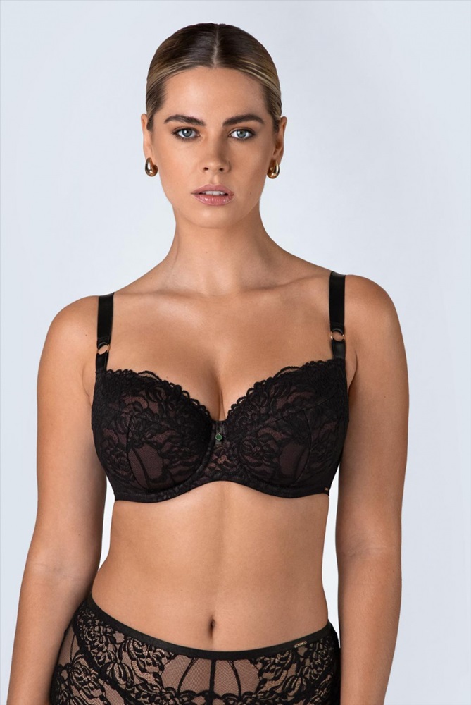 Бюстгальтер TruffleNoir PU выполнен на основе бюста Sublime, на косточках (на каркасах), с дополнительными боковыми поддержками, чашки шитые, нижняя часть на тонком поролоне цвета трюфеля, внутренняя сторона проложена хлопковым трикотажем, внешняя и верхняя часть чашки из кружевного полотна, спинка из черной продублирована сеткой цвета трюфеля. Бретельки не отстёгиваются, регулируются по длине. На спине застёжка на удлинитель, количество крючков в ряду застёжки, увеличивается пропорционально размеру бюстгальтера, фурнитура металлическая цвета желтого золота. Бюстгальтер идеально сочетается с трусиками TruffleNoir.