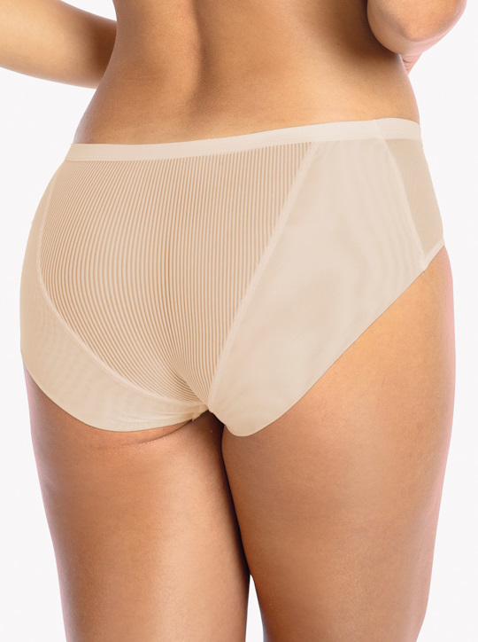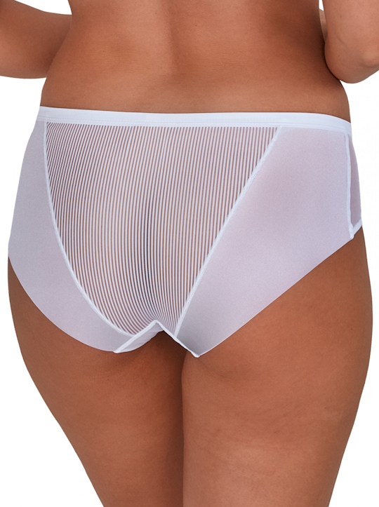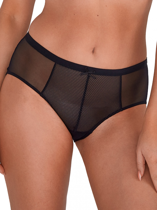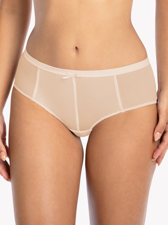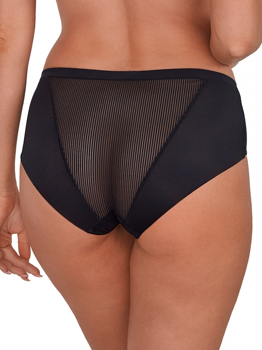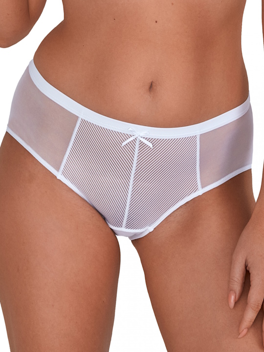 Трусики слип 1058 Sonia со средней линией талии выполнены из эластичной полосатого трикотажа и сетки, на спинке вставки из сетки, сложенной вдвое. Ластовица проложена 100% хлопком. Трусики идеально комплектуются с бюстгальтерами 1058 Sonia.