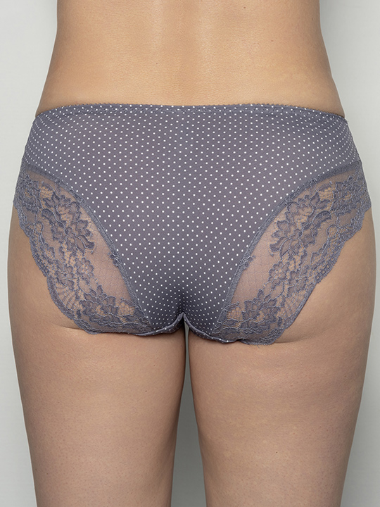 Состав: Полиамид – 65%, Эластан – 20%, Хлопок – 15% Трусы-слип со средней линией талии. Выполнены из эластичной принтованной микрофибры в горошек и эластичного кружева. Срезы по краю ножек обработаны на плоскошовной машине. Украшение: атласный бантик.