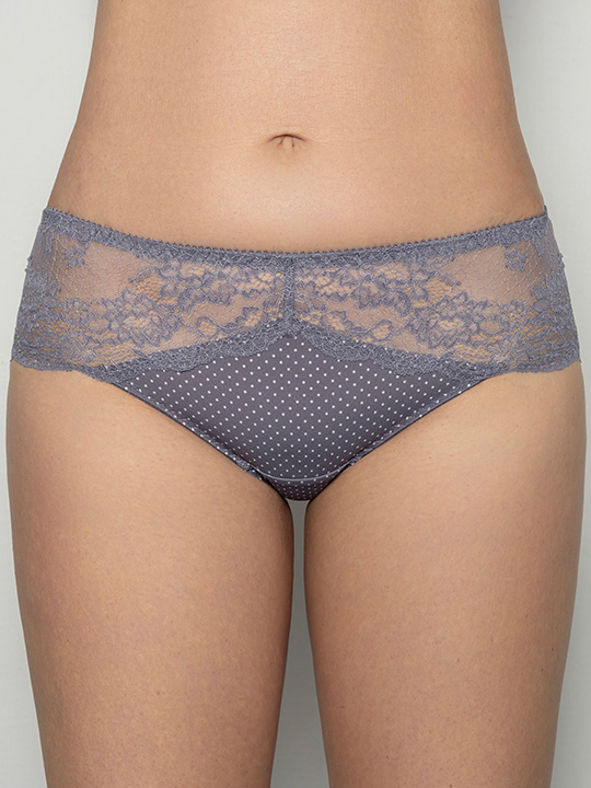 Состав: Полиамид – 65%, Эластан – 20%, Хлопок – 15% Трусы-слип (панти) с заниженной линией талии. Выполнены из эластичной принтованной микрофибры в горошек и эластичного кружева. Срезы по краю ножек обработаны на плоскошовной машине.