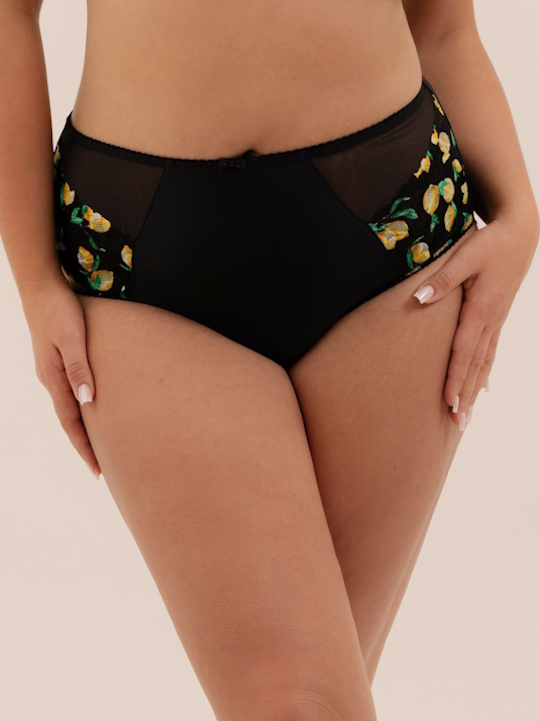 Состав: полиамид 70%, эластан 20%, хлопок 10% Женские трусики бразильяна A-222 спереди выполнены из микрофибры, по бокам вставки из гипюра с принтом  лимончики продублированы черной сеткой, спинка из сетки, сложенной вдвое, ластовица проложена 100% хлопком. Идеальный вариант для повседневной носки.