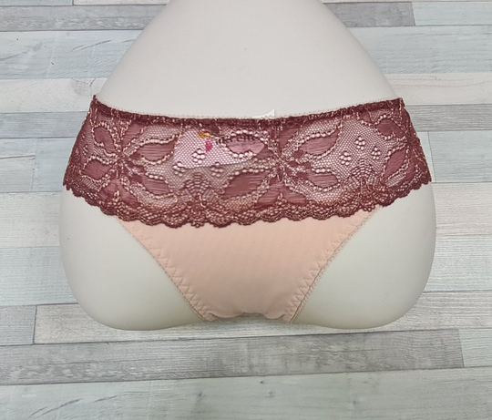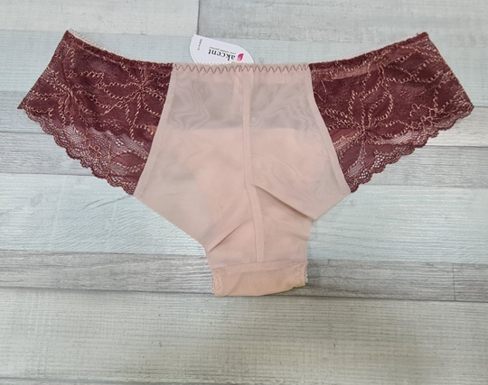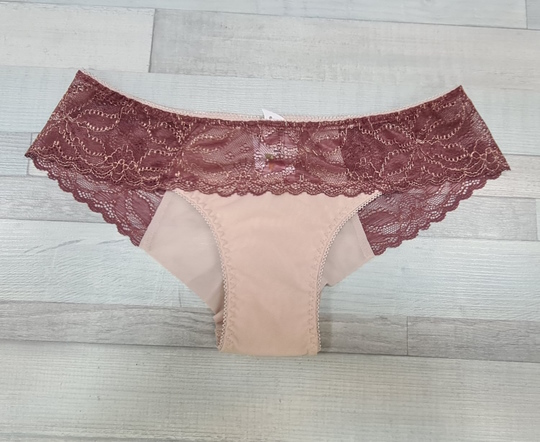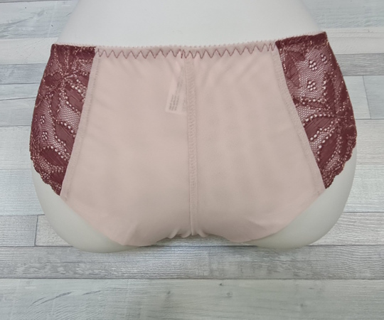 Трусики бразильяна A-89 выполнены из кружева цвета розовый рубин (фламинго) с люрексом, спереди вставка из телесной сетки продублирована хлопковым телесным трикотажем , резинки телесного цвета, на спинке вставка из телесной сетки, сложенной вдвое. Ластовица проложена 100% хлопком телесного цвета. Идеально сочетаются с бюстом A-89. Идеальный вариант для повседневной носки.