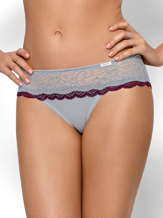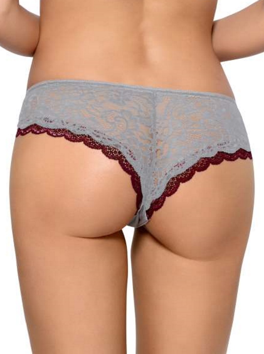 Бренд: Nipplex Трусики бразильяна Aurora из эластичного трикотажа и гипюра серого цвета, проймы ног украшены бордовым кружевом. Ластовица из 100% хлопка. Идеально сочетаются с бюстгальтерами Aurora.