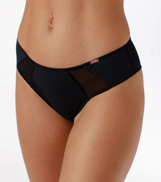Состав: 85% ПОЛИАМИД/ 10% ЭЛАСТАН/ 5% ХЛОПОК Трусы-бразилиана со средней линией талии, выполнены из эластичной микрофибры и сетки с декоративным геометрическим рисунком. Украшение: медальон COQUETTE REVUE.