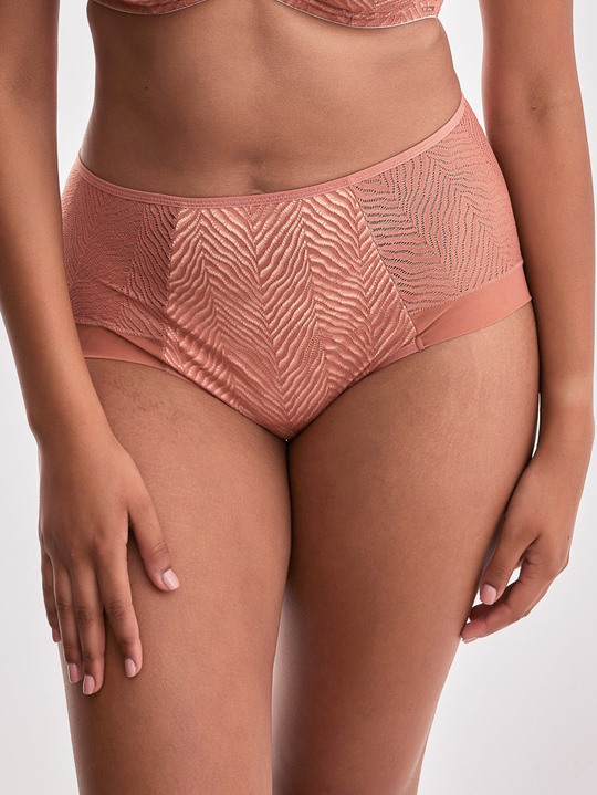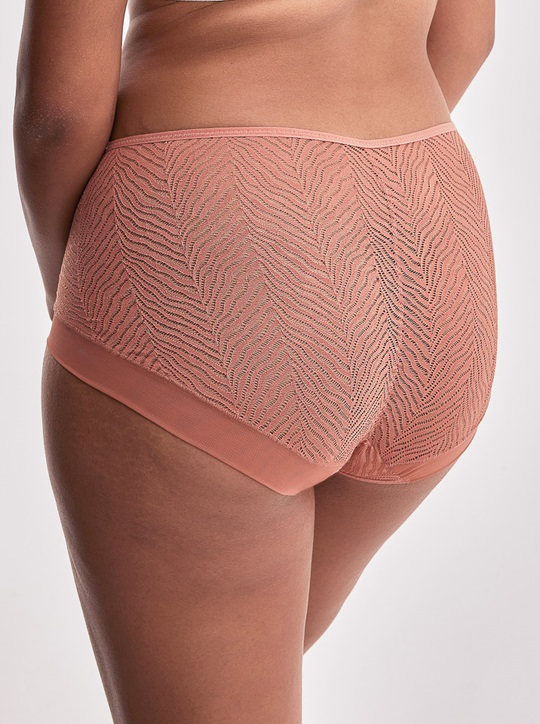 Трусики слип с завышенной талией из коллекции Celeste выполнены из эластичного кружевного полотна цвета лососевый розовый, спереди продублированы сеткой телесного цвета, проймы ног из кружевного полотна, сложенного вдвое. Ластовица из 100% хлопка телесного цвета. Идеально сочетаются с бюстгальтерами Celeste.