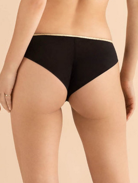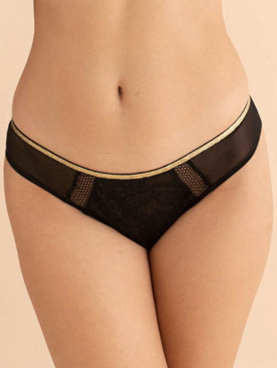 Трусики бразильяна из коллекции Chiara из кружевного полотна, продублированного сеткой и сетки, спинка из сетки, сложенной вдвое, резинка узкая с золотым люрексом. Ластовица проложена 100% хлопком.