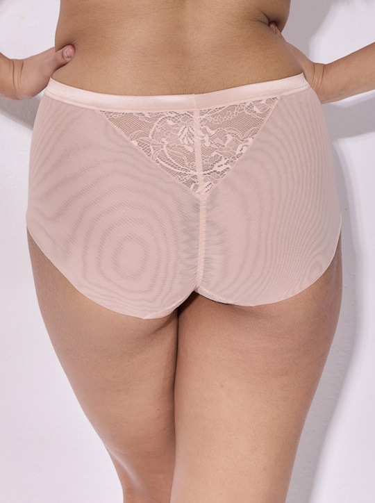 Состав: полиамид 70%, полиэстер 15%, эластан 10%, хлопок 5% Трусики классические с высокой талией из коллекции Chiara выполнены в телесном цвете из кружевного полотна и сетки, спинка из сетки, сложенной вдвое, с V-образной вставкой кружева. Ластовица проложена 100% хлопком. Комментарии к товару