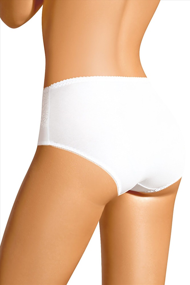 Трусы-макси женские из плотного эластичного хлопкового полотна. Обработка краев - ажурная резинка с фестоном. По переду вставки из кружева и бант.