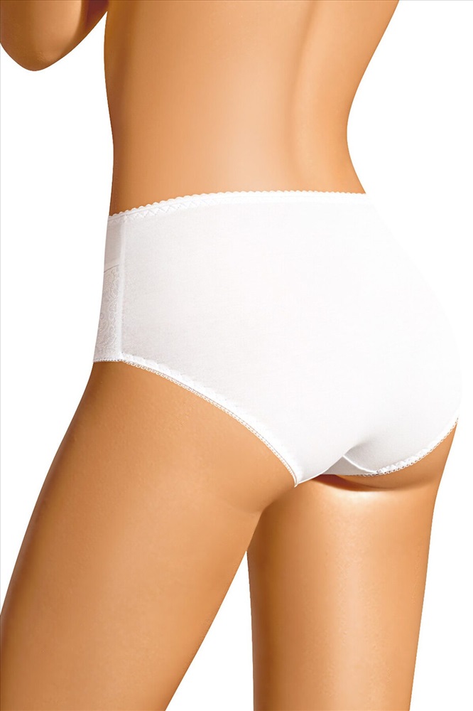 Трусы-макси женские из плотного эластичного хлопкового полотна. Обработка краев - ажурная резинка с фестоном. По бокам вставки из кружева. По переду бант.