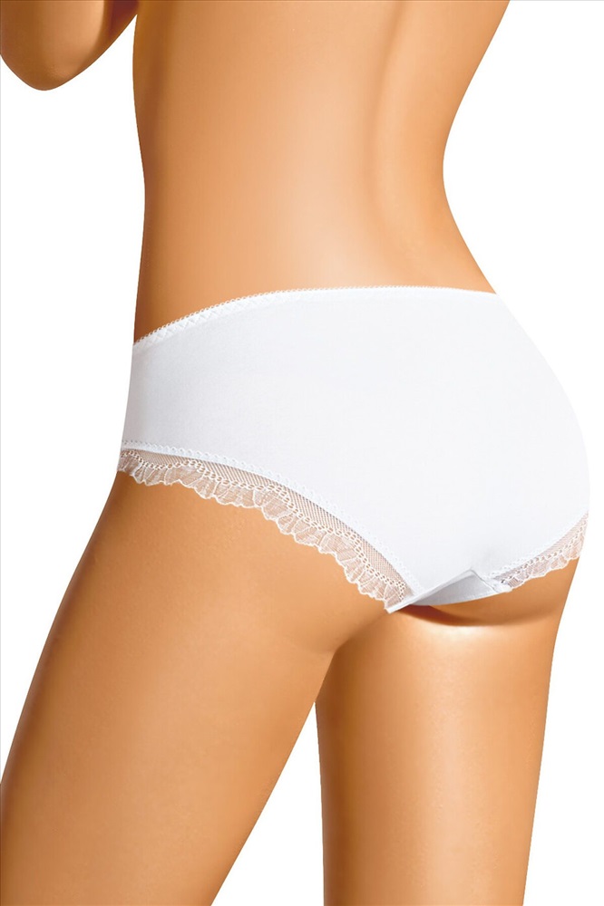 Трусы-слипы женские из эластичного хлопкового полотна. Обработка краев по талии - ажурная резинка с фестоном, по ноге - кружево. Спереди бант.