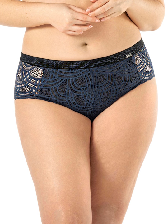 Состав: полиамид 60%, полиэстер 16%, хлопок 10%, эластан 7%, другие 7% Трусы шорты Debora выполнены из темно-синего кружева, спереди продублированы черной сеткой, резинка широкая эластичная, ластовица из 100% хлопка. Комментарии к товару
