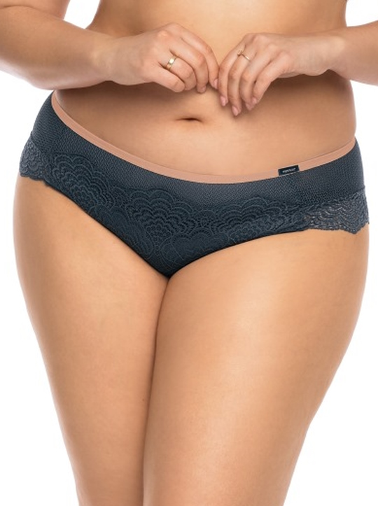 Трусики шорты Estera выполнены из кружевного полотна, продублированы спереди и сзади темно-синей сеткой, спинка из сетки, проймы ног украшены широким кружевом, тонкая резинка контрастного розового цвета. Ластовица из 100% хлопка. Идеально сочетаются с бюстгальтерами Estera.