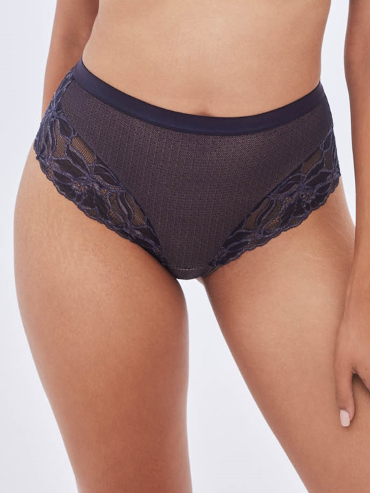 Трусики стринг с завышенной талией из коллекции Glow выполнены из роскошного кружева с легким мерцанием, спереди сетка в крапинку продублирована телесной сеткой, на спинке пикантный вырез украшен эластичными резинками и металлическим аксессуаром цвета розового золота. Ластовица проложена 100% хлопком телесного цвета.