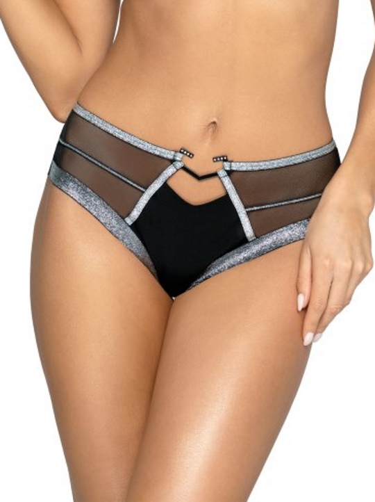 Состав: полиамид 91%, эластан 4%, хлопок 5% Трусики бразильянки Halley спереди из сетки, декорированы страпами и резинками с серебряным люрексом, которые соединяются с металлическим декоративным элементом с кристаллами, спинка из трикотажа и сетки, сложенной вдвое. Ластовица из 100% хлопка. Идеально сочетаются с бюстгальтером Halley.