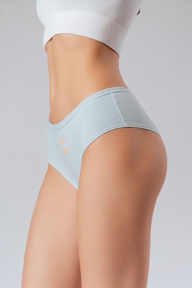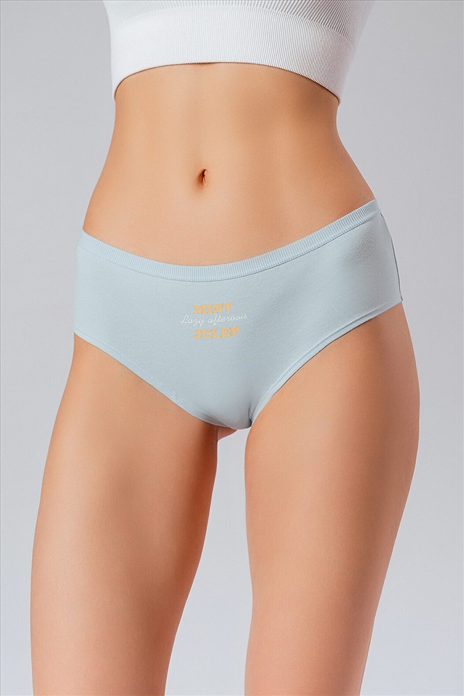 Страна производства: Китай Трусы слипы женские 5010LUF бренда Indefini изготовлены из хлопковой ткани с добавлением эластана. Выполнены в светло-голубом цвете. Трусы средней посадки держатся на талии мягкой резинкой в тон основной ткани.. На внутренней стороне трусов имеется хлопковая ластовица. На трусы нанесён принт с надписью «MINT», «Lazy afternoon» и «JULEP» в оранжево-бежевых тонах.