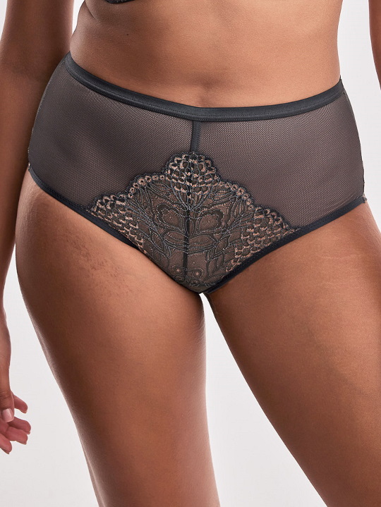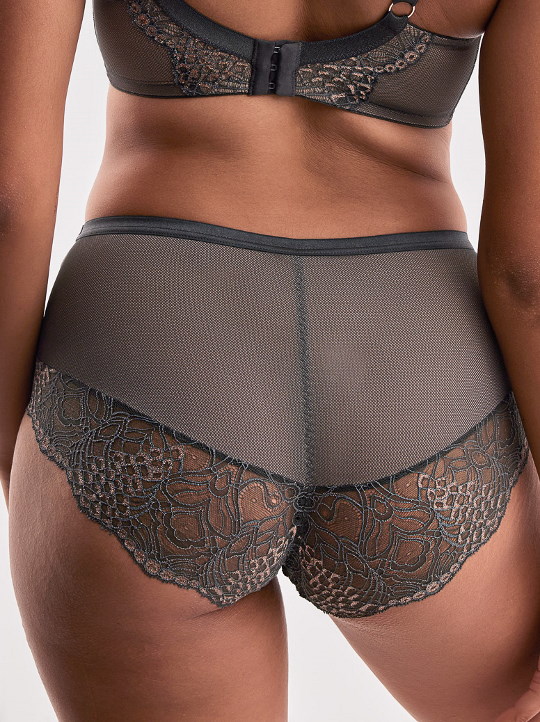 Трусики слип с высокой линией талии из коллекции Lusso из эластичного кружевного полотна цвета хаки с золотым люрексом и сетки цвета хаки, продублированной телесной сеткой. Ластовица из 100% хлопка телесного цвета. Идеально сочетаются с бюстгальтерами Lusso.