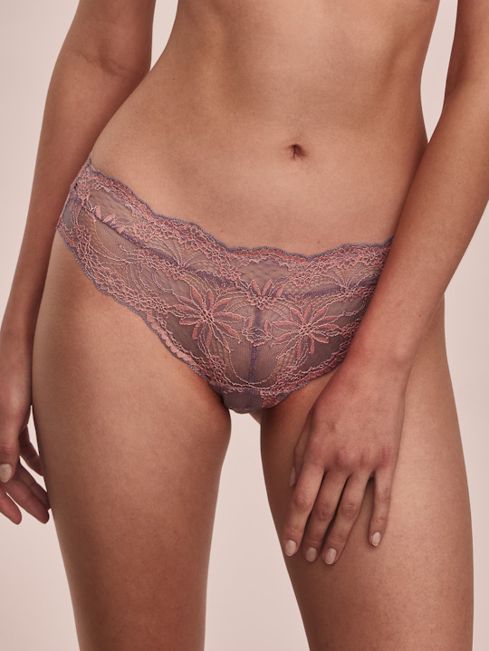 Состав: полиамид 40%, вискоза 30%, эластан 20%, хлопок 10% Трусики стринг с широким бочком из коллекции Madera выполнены из эластичного сиренево-розового кружева с цветочным узором,  на спинке небольшой V-образный вырез с тонкими союзками. Ластовица из 100% хлопка. Идеально сочетаются с бюстгальтерами Madera.