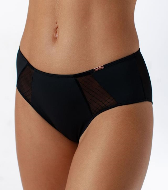Состав: 85% ПОЛИАМИД/ 10% ЭЛАСТАН/ 5% ХЛОПОК Трусы-панти со средней линией талии, выполнены из эластичной микрофибры и сетки с декоративным геометрическим рисунком. Украшение: медальон COQUETTE REVUE.