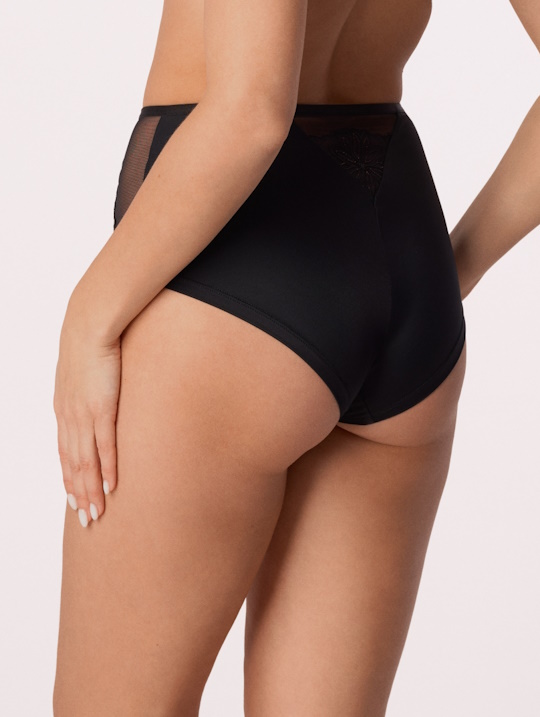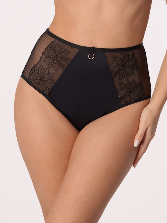 Состав: полиамид 80%, эластан 15%, хлопок 5% Трусики слип Roxane с завышенной линией талии выполнены из микрофибры, спереди по бокам вставки из сетки с цветочной вышивкой медным люрексом, на спинке V-образная вставка из сетки с вышивкой. Ластовица проложена 100% хлопком. Трусики идеально комплектуются с бюстгальтерами Roxane. Параметры модели бюстгальтер 85E, трусы XL, 70F/M. Комментарии к товару