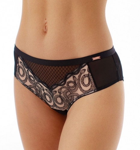 Состав: 85% ПОЛИАМИД/ 10% ЭЛАСТАН/ 5% ХЛОПОК Трусы-слип со средней линией талии, выполнены из сетки с декоративной вышивкой в виде змеи. Украшение: медальон COQUETTE REVUE и кольцо в виде змеи.