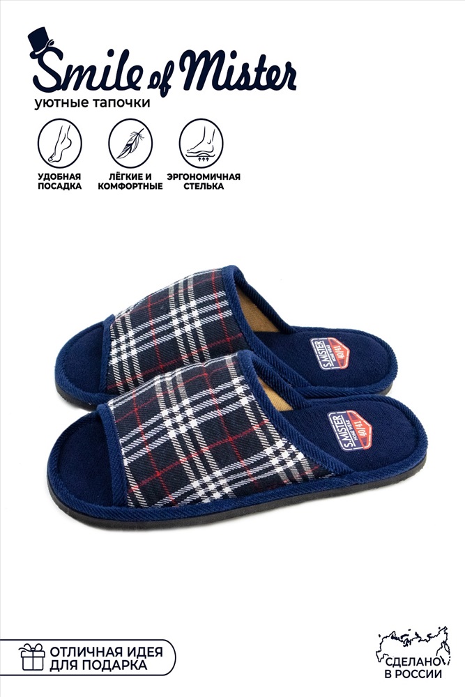 Состав: текстиль, ЭВА Модель: Туфли комнат. муж. А-150-031-02 отк Тип товара: тапки Материал: смесовая ткань Бренд: РПТ АО Назначение: для дома Особенности: открытая пятка | открытый носок Рисунок: клетка Сезонность: лето | осень | весна | зима Стиль: домашний Открытые домашние мужские тапочки от бренда Smile of Mister - лучший выбор для Ваших ног. В таких тапках ноги не будут преть, но вместе с тем модель теплая и подойдет для зимы. Шлепки легкие и комфортные, имеют эргономичную посадку. Открытый мысок обеспечивает дополнительную вентиляцию для ног. Комфортная стелька выполнена из текстиля, благодаря чему стопа не будет потеть. Таблица размеров и веса
