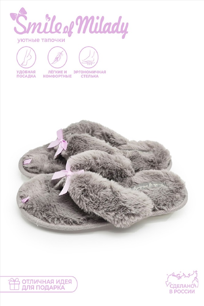 Стиль: домашний Комнатные женские тапочки вьетнамки от бренда Smile of Milady - стильная и комфортная домашняя обувь. В этих меховых тапках нога отдыхает после насыщенных рабочих будней и активных выходных. Модель теплая, пригодится в межсезонье и зиму. Мягкие домашние сланцы можно взять с собой в путешествие, в командировку, на дачу.Запасите несколько пар для гостей. Шлепанцы для женщин подойдут на широкую ногу, полную стопу. Шлепки имеют гибкую подошву из экологичного материала эва (eva). Она не скользит, достаточно мягкая и прочная, обеспечит амортизирующий эффект, снижающий усталость ног.