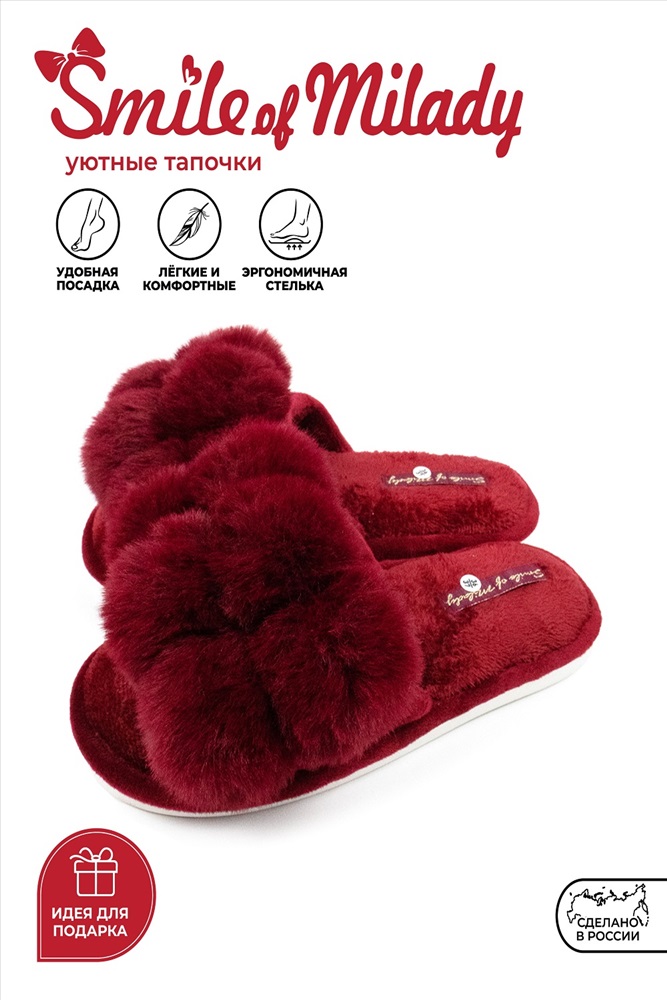 Стиль: домашний Комнатные женские тапочки от бренда Smile of Milady - стильная и комфортная домашняя обувь. В этих открытых тапках нога отдыхает после насыщенных рабочих будней и активных выходных. Модель теплая, пригодится в межсезонье и зиму.Мягкие домашние сланцы можно взять с собой в путешествие, в командировку, на дачу.Запасите несколько пар для гостей.Шлепанцы для женщин подойдут на широкую ногу, полную стопу. Шлепки имеют гибкую подошву из экологичного материала эва (eva). Она не скользит, достаточно мягкая и прочная, обеспечит амортизирующий эффект, снижающий усталость ног.Это красивая дизайнерская домашняя обувь, в которой приятно проводить время и заниматься делами.