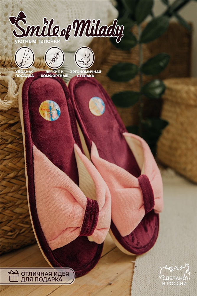 Стиль: домашний Комнатные женские тапочки от бренда Smile of Milady - стильная и комфортная домашняя обувь. В этих текстильных открытых тапках нога отдыхает после насыщенных рабочих будней и активных выходных. Модель теплая, пригодится в межсезонье и зиму. Мягкие домашние сланцы можно взять с собой в путешествие, в командировку, на дачу. Запасите несколько пар для гостей. Шлепанцы для женщин подойдут на широкую ногу, полную стопу. Шлепки имеют гибкую подошву из экологичного материала эва (eva). Она не скользит, достаточно мягкая и прочная, обеспечит амортизирующий эффект, снижающий усталость ног. Это красивая дизайнерская домашняя обувь, в которой приятно проводить время и заниматься делами.
