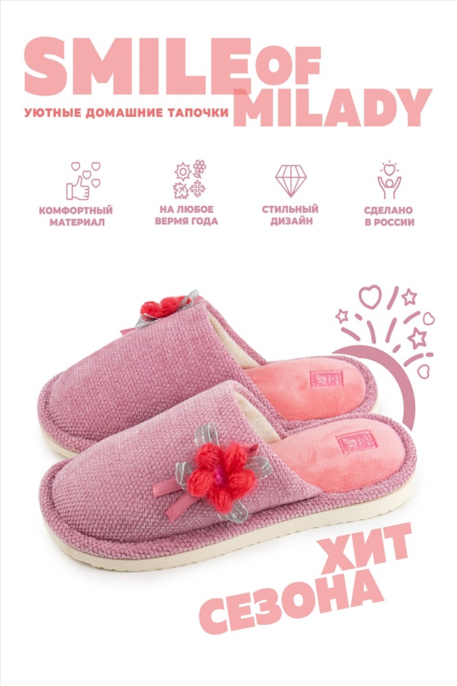 Состав: текстиль 60%, EVA 40% Модель: Туфли комнат. жен. А-82-080-07 зак Тип товара: тапки Бренд: РПТ АО Назначение: для дома НДС: 22% Особенности: открытая пятка | закрытый носок Рисунок: цветы Сезонность: лето | осень | весна | зима Стиль: домашний Комнатные женские тапочки от бренда Smile of Milady - стильная и комфортная домашняя обувь. В этих мягких закрытых тапках нога отдыхает после насыщенных рабочих будней и активных выходных. Модель теплая, пригодится в межсезонье и зиму. Мягкие домашние сланцы можно взять с собой в путешествие, в командировку, на дачу. Запасите несколько пар для гостей. Шлепанцы для женщин подойдут на широкую ногу, полную стопу. Шлепки имеют гибкую подошву из экологичного материала эва (eva). Она не скользит, достаточно мягкая и прочная, обеспечит амортизирующий эффект, снижающий усталость ног. Это красивая дизайнерская домашняя обувь, в которой приятно проводить время и заниматься делами. В таблице размеров указана длина стопы, используйте этот параметр, что верно определить нужный размер Таблица размеров и веса