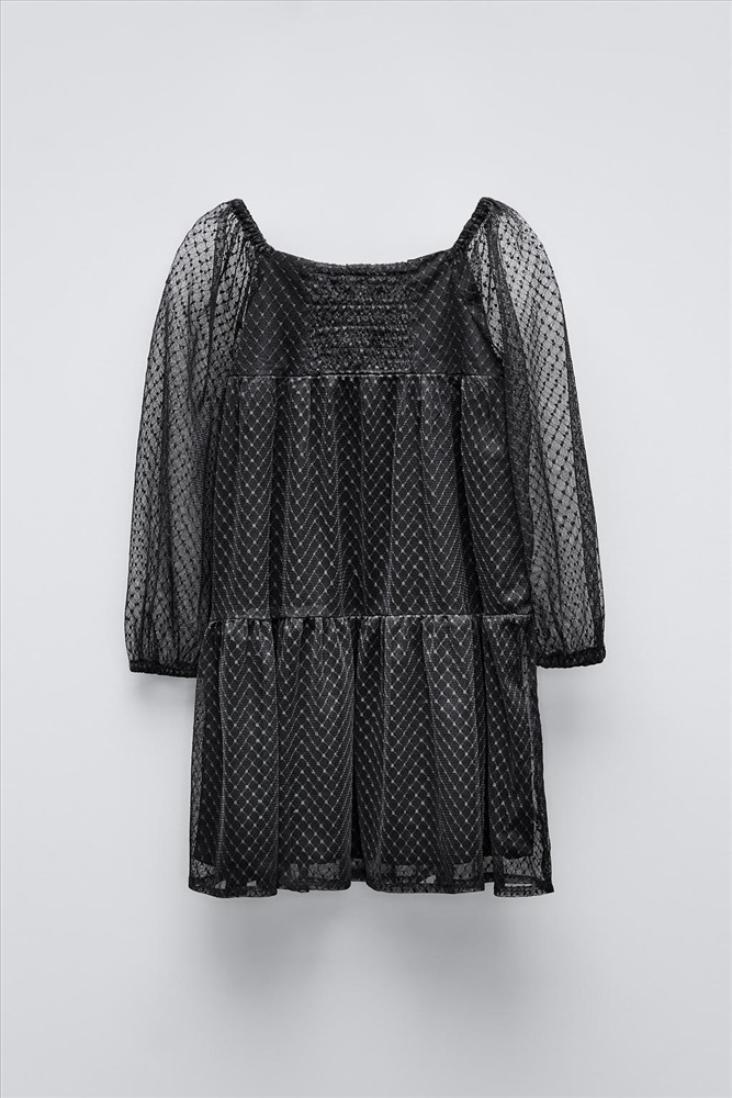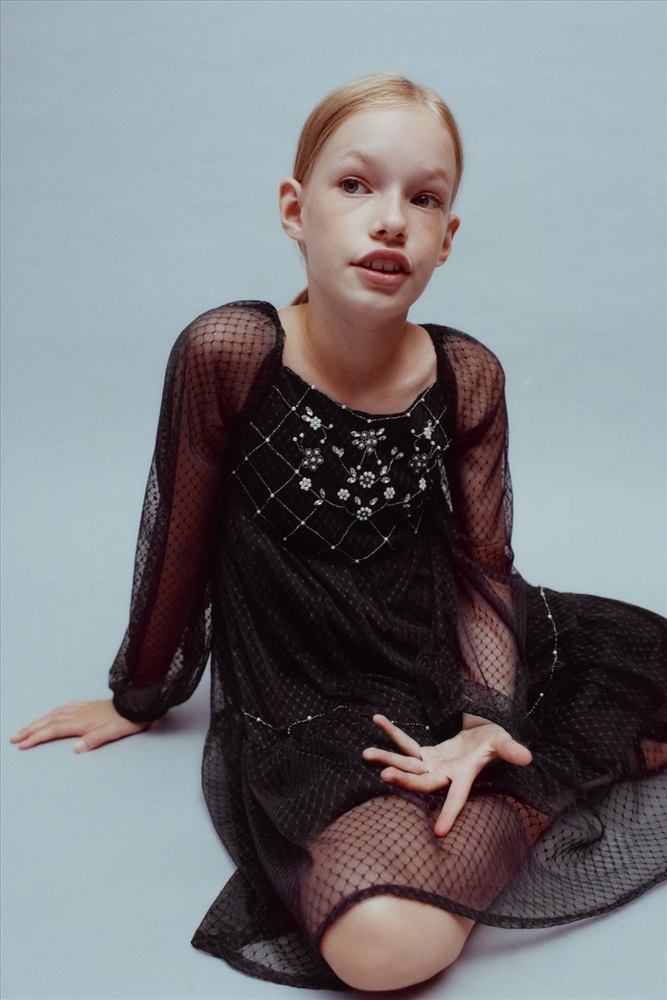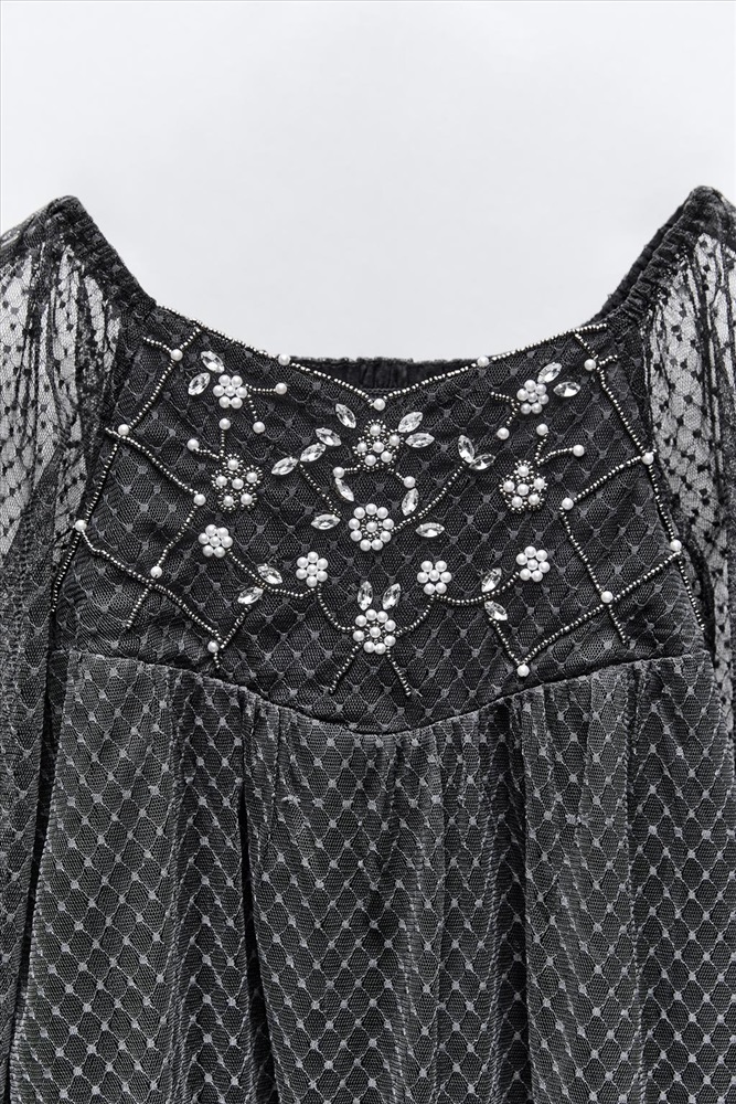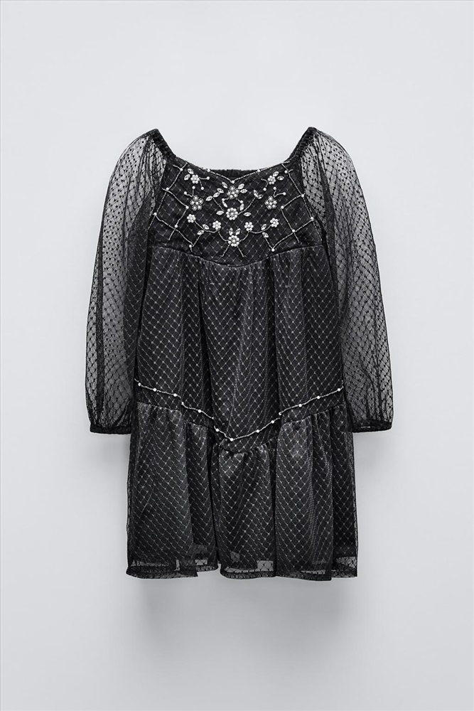 Dress with a straight neckline, long sleeves and elasticated cuffs. Featuring rhinestone appliqués on the bodice and hem, and elasticated detailing on the back. COMPOSITION, CARE & ORIGIN COMPOSITION OUTER SHELL 100% polyester LINING 100% cotton Which contains at least: OUTER SHELL 100% RCS certified recycled polyester LINING 100% OCS certified organically grown cotton CERTIFIED MATERIALS RCS CERTIFIED RECYCLED POLYESTER Nowadays, recycled polyester is mainly made from PET plastic waste. This is a type of plastic that is widely used in a variety of items, such as plastic bottles. Using recycled materials helps limit the production of virgin polyester fibre. It is certified to the Recycled Claim Standard (RCS), which verifies the recycled content and tracks it from source to final product. Certified by Intertek 193341 More information OCS CERTIFIED ORGANICALLY GROWN COTTON This fibre is produced using no artificial fertilisers or pesticides and is grown from seeds that have not been genetically modified. We are currently working with the Organic Content Standard (OCS) that monitors the process from the source to the end product. Certified by Intertek 193341 More information CARE Caring for your clothes is caring for the environment. Lower temperature washes and delicate spin cycles are gentler on garments and help to protect the colour, shape and structure of the fabric. Furthermore, they reduce the amount of energy used in care processes.