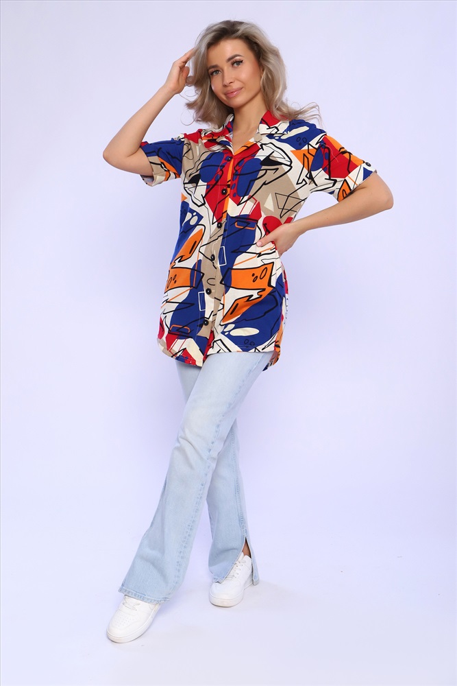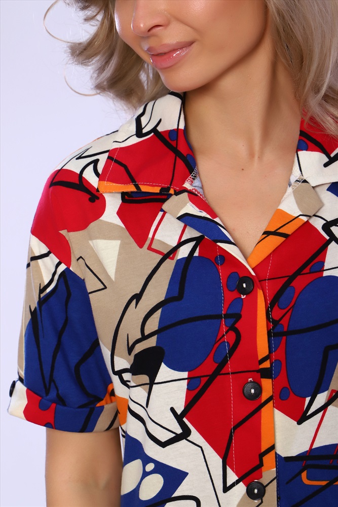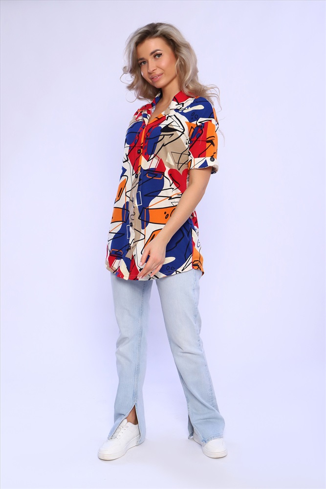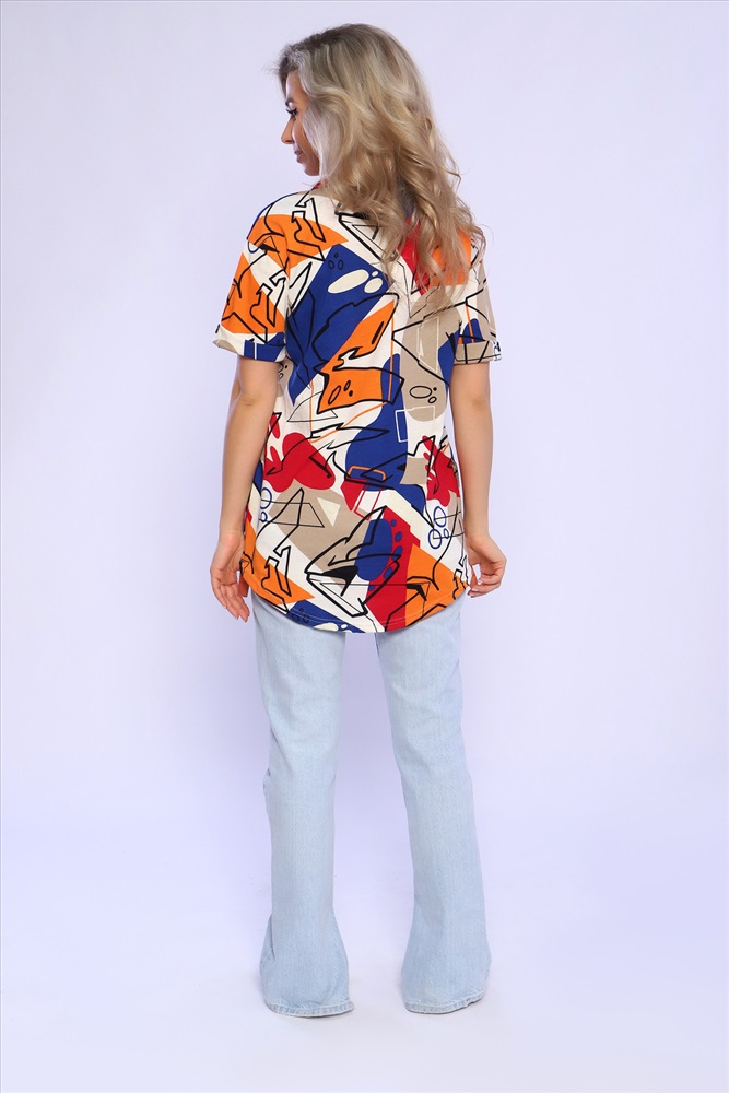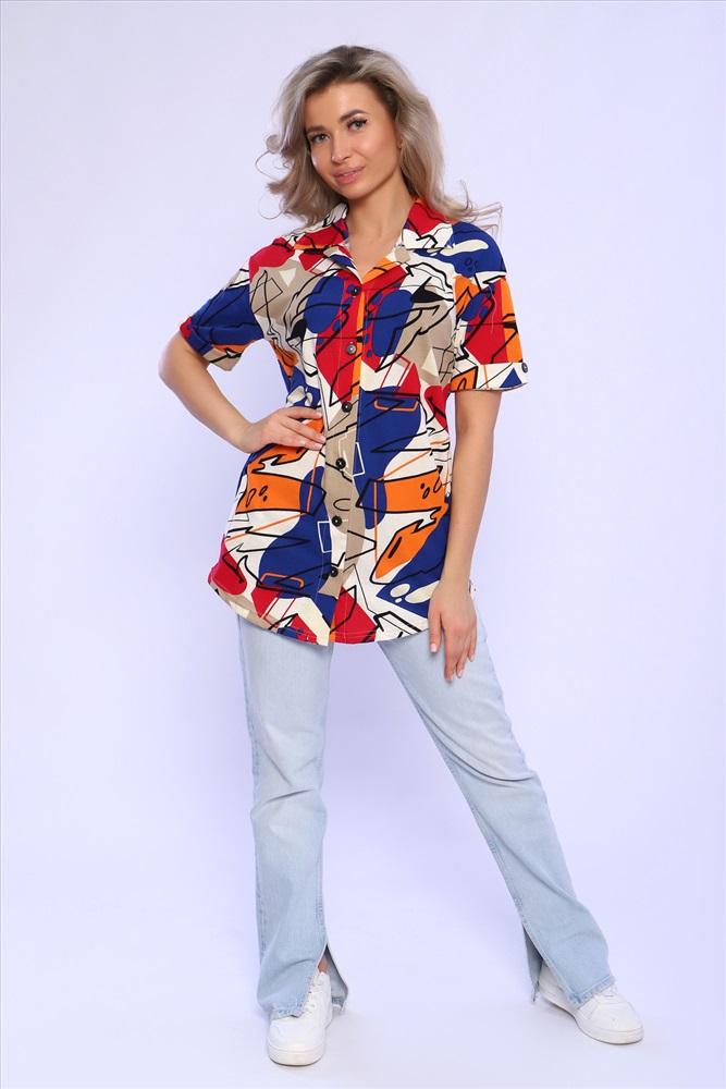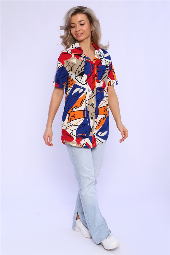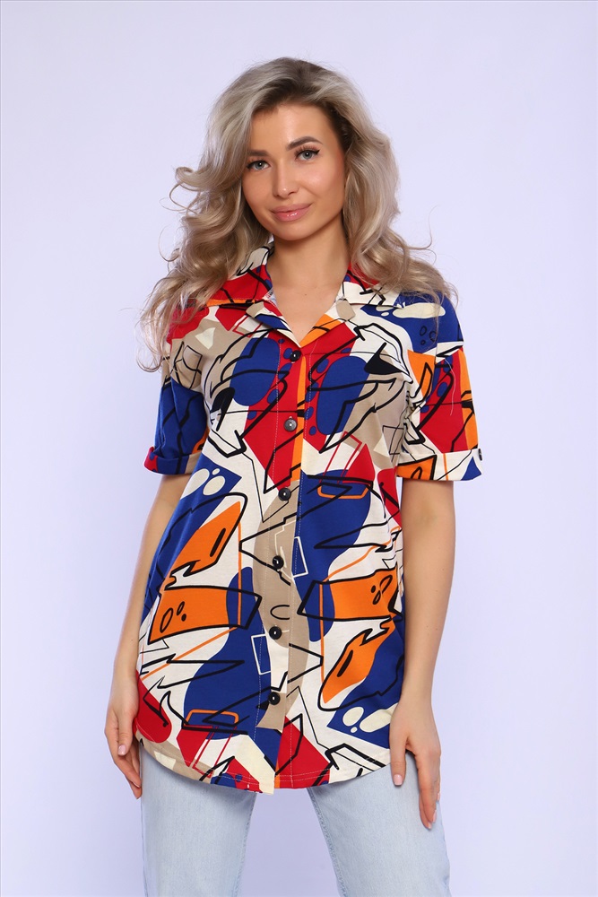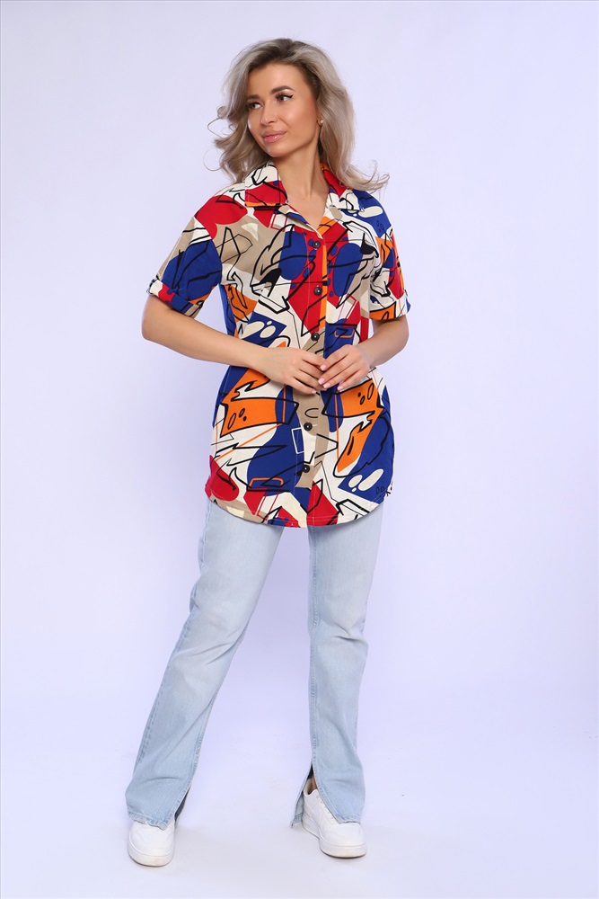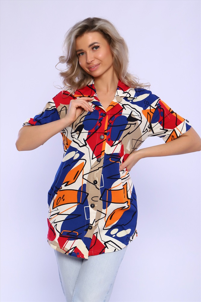 Застежка: пуговицы Туника полуприлегающего силуэта на пуговицах и рубашечным воротником. Короткие рукава с отворотными манжетами, закрепленными пуговицами. Карманы в боковых швах. Низ изделия полукруглый с удлиненной спинкой.