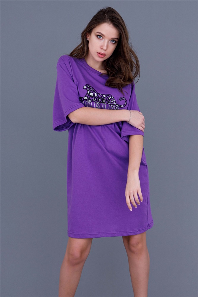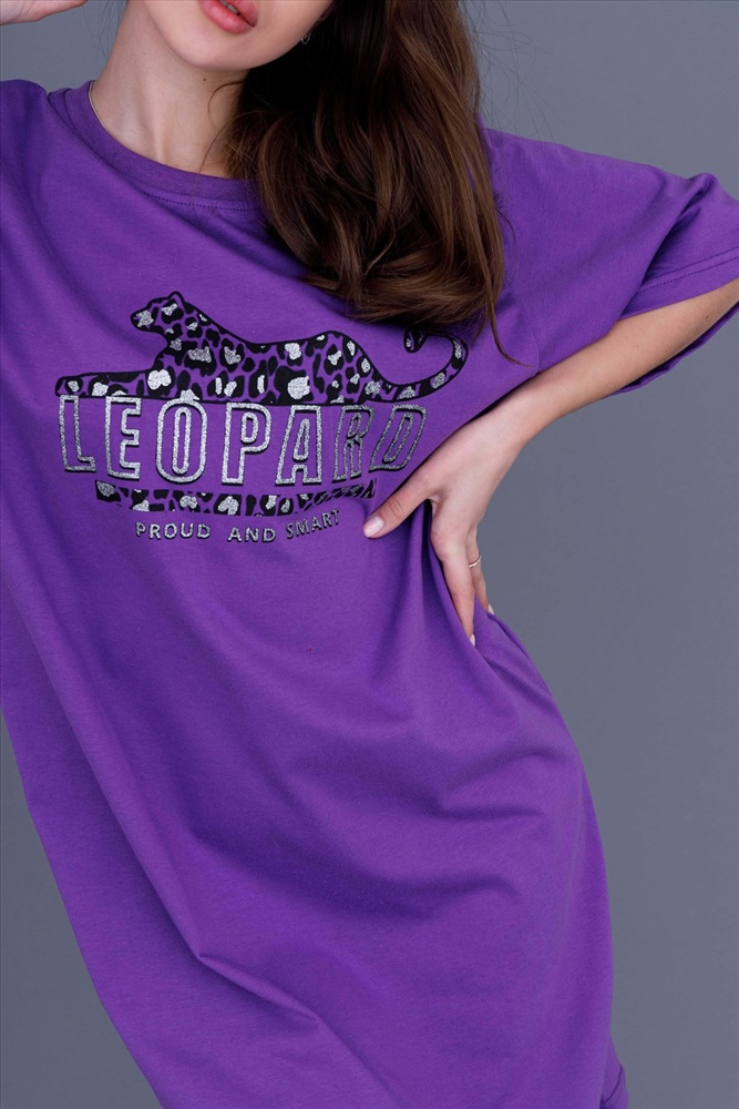 Застежка: без застежки Платье-туника оверсайз с широкими рукавами. Горловина округлой формы обработана качественной рибаной с лайкрой, поэтому после стирки не растягивается. Оригинальный принт на полочке в виде стилизованного леопарда привлекателен именно в своей простоте. Фасон подходит для всех типов фигуры. Принт с серебряным глиттером. Длина рукава указана от основания шеи.