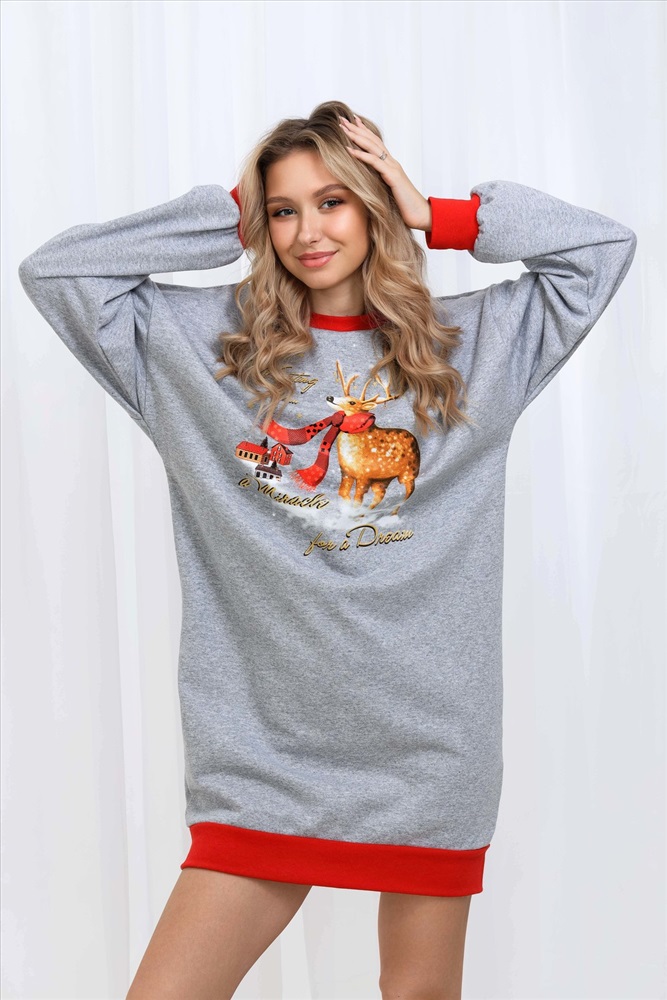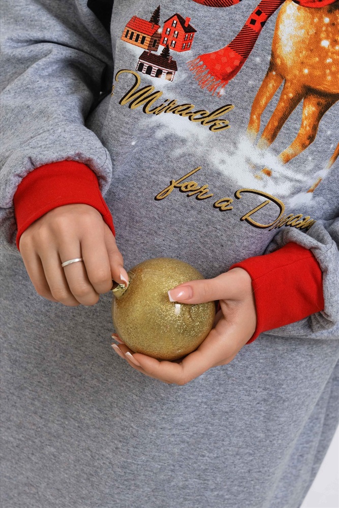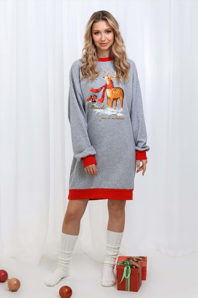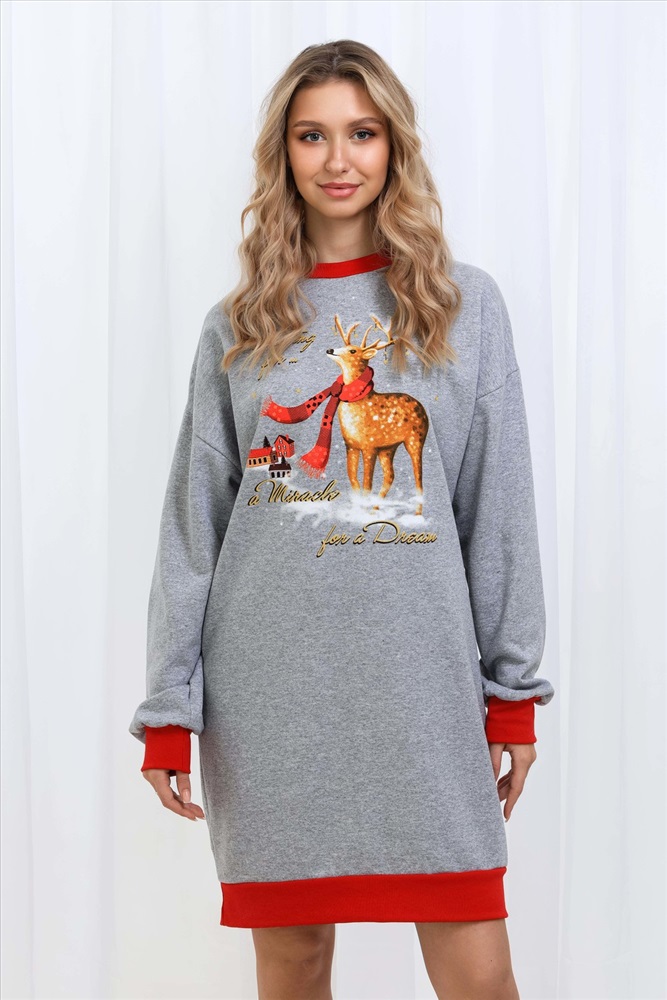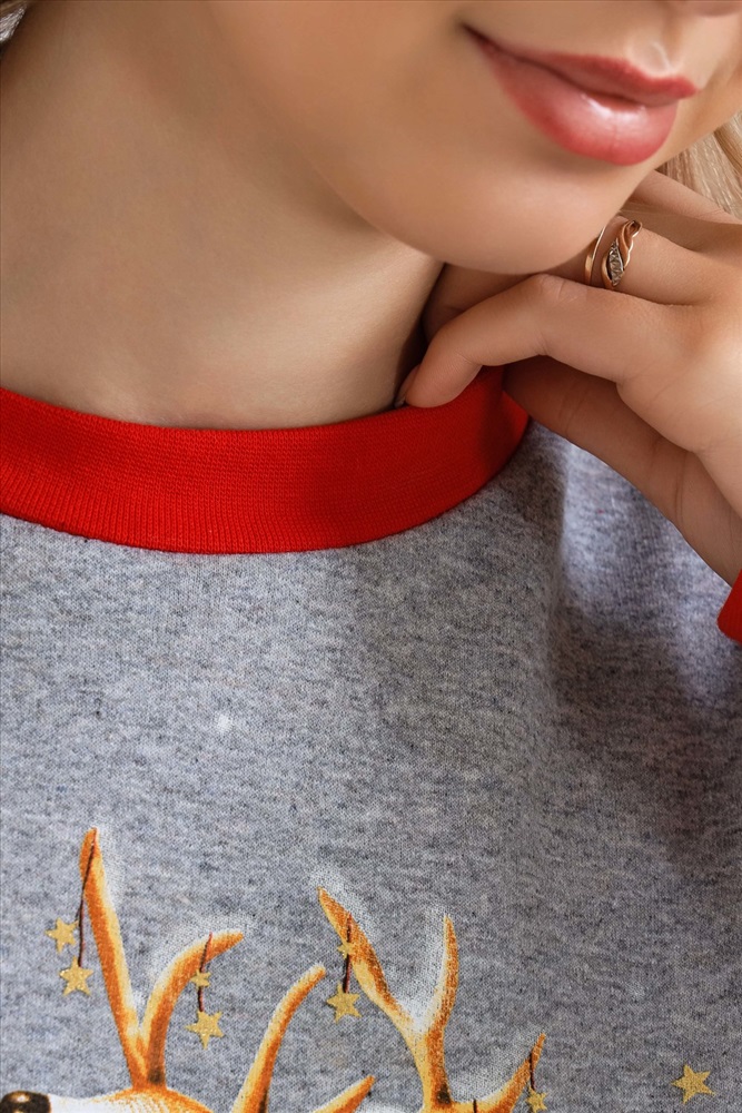 Застежка: без застежки Олени - неотъемлемый атрибут Рождества. Традиция использовать в новогоднем убранстве рождественских оленей завоевала большую популярность во всём мире. В этой уютной удобной домашней тунике из футера двух нитки с начёсом комфортно находиться в домашней обстановке. В ней можно встретить праздник, использовать в повседневной носке и в качестве подарка. Туника свободного кроя, рукава с напуском. Все манжеты на изделии выполнены из плотной рибаны с лайкрой. Длина рукава в измерениях указана от основания шеи.