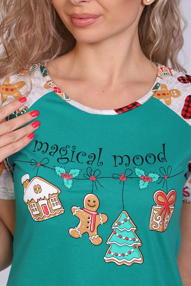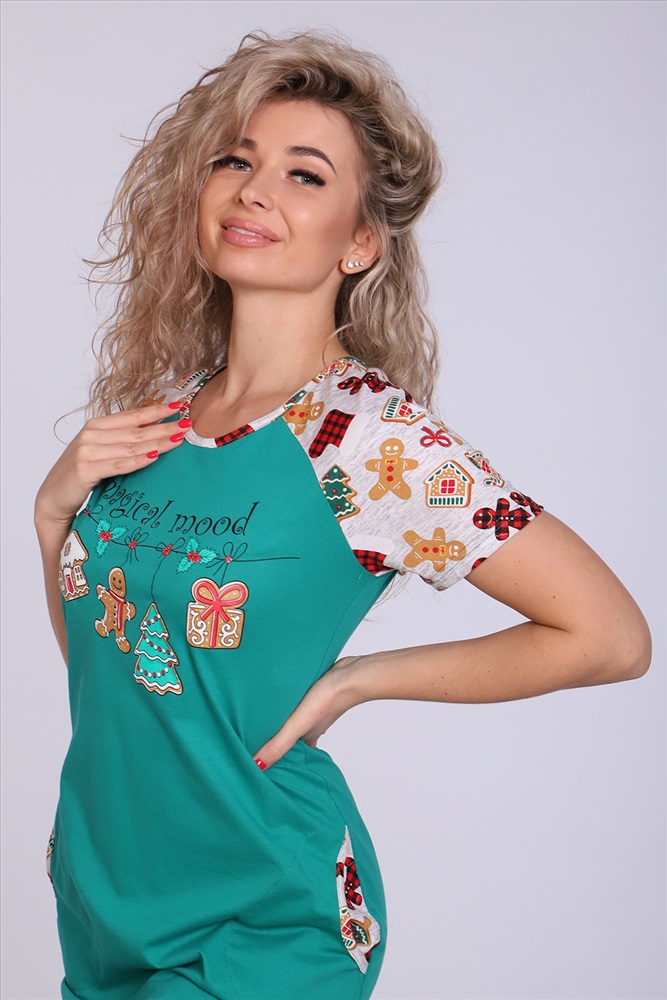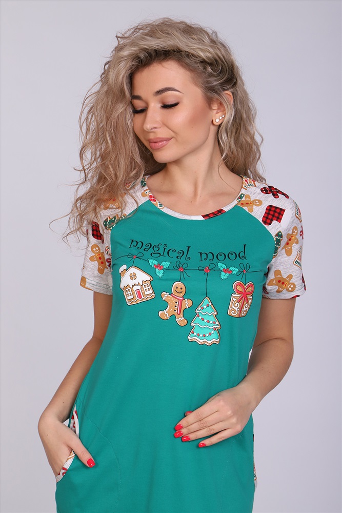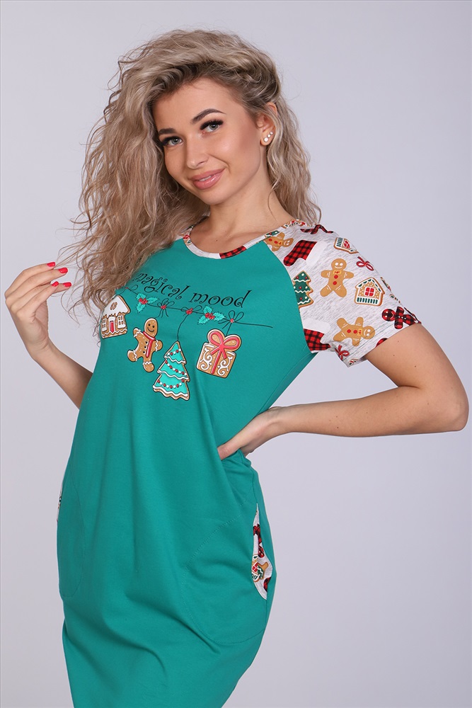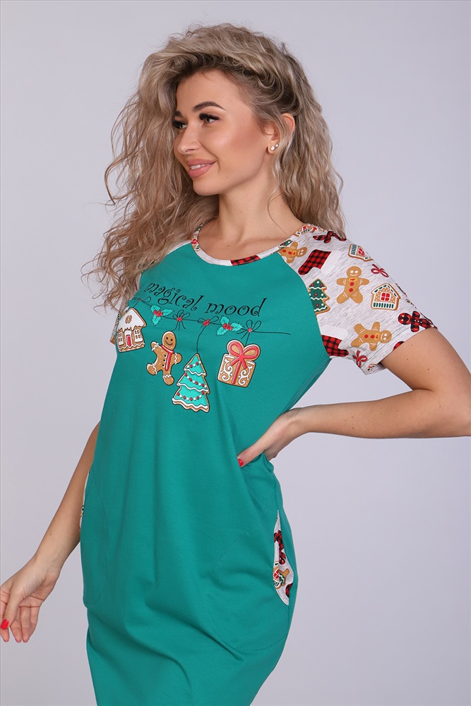 Застежка: без застежки Женское платье-туника длиной чуть выше колена с милым принтом на полочке в виде атрибутов новогодних праздников, короткими рукавами-реглан контрастного цвета и округлой горловиной. Низ платья закруглен и образует небольшие разрезы по бокам. Горловина и вход в карманы обработаны окантовкой из ткани рукавов. Наличие боковых карманов добавит дополнительный комфорт при использовании. Выполнена из трикотажного полотна, 100% хлопок. Удобная, модная приятная к телу. Не стесняет движения. Яркие стойкие цвета соответствуют модным тенденциям. Можно носить, как домашнюю тунику или уличное платье. Для дома и отдыха, для дачи. Новогодняя тематика принтов делает эту модель отличным подарком девушкам на Новый год!