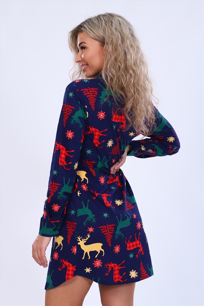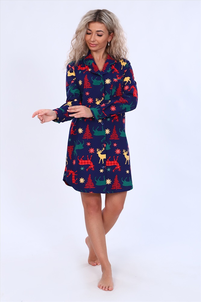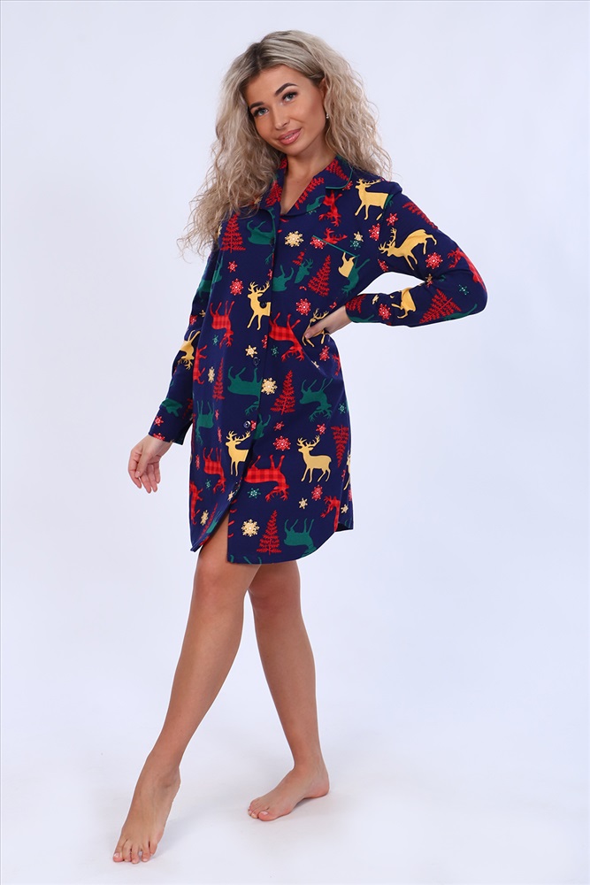 Застежка: пуговицы Женское платье-рубашка на пуговицах чуть выше колена с длинным рукавом на манжете. Разрез рукава окантован. На груди с левой стороны накладной карман с отделкой из канта. Воротник фигурный, рубашечного типа, обработан кантом. Низ рубашки закруглен и образует небольшие разрезы по бокам. Модель выполнена из высококачественного 100% хлопка, на ощупь ткань напоминает фланель, что создает комфорт и уют при носке. Модный дизайн модели и принту по ткани в виде оленей. Можно носить дома как халат-рубашку или на улице как платье-тунику. Подойдет на любую фигуру, скроет недостатки. Отлично смотрится на беременных. Широкий размерный ряд с 42 по 56. Отличный подарок любимым на праздник и по любому поводу!