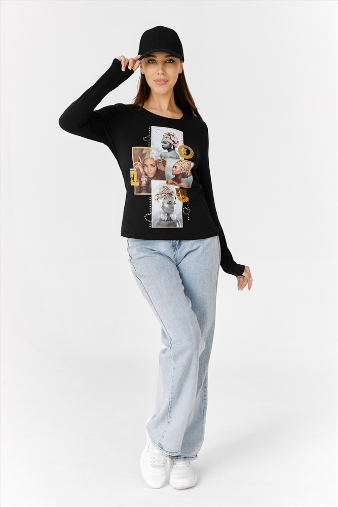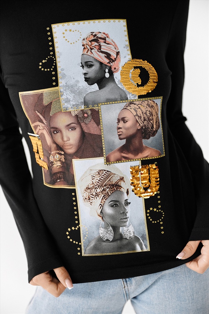 Застежка: без застежки Туника полуприлегающего силуэта, с округлой горловиной, длиной до середины бедра. Рукав втачной, длинный. Горловина обработана бейкой из основного полотна. На полочке красивая печать, декорированная золотыми пайетками