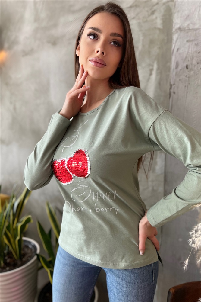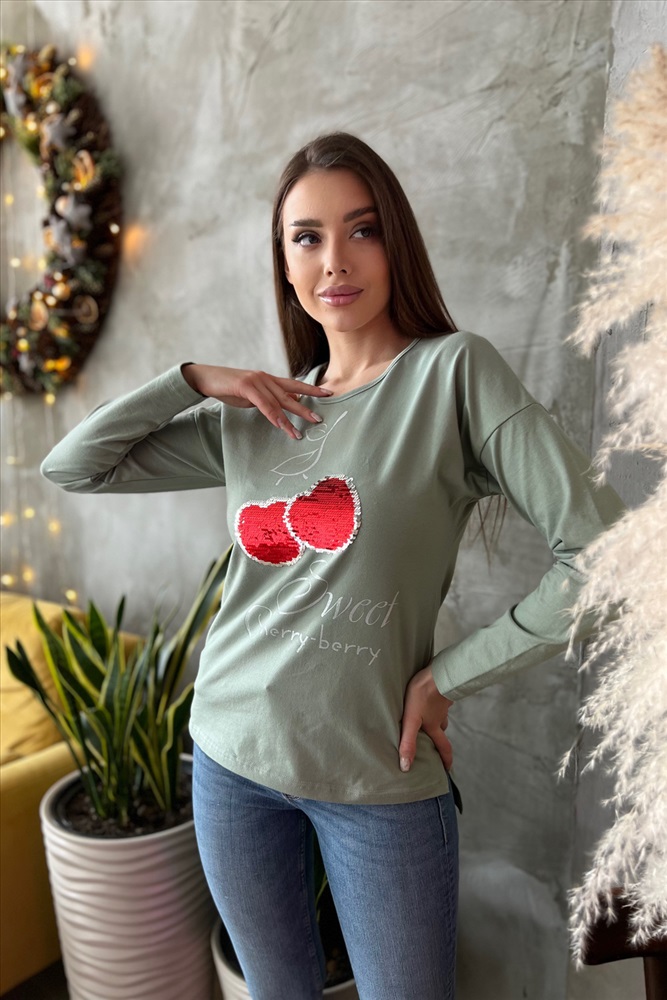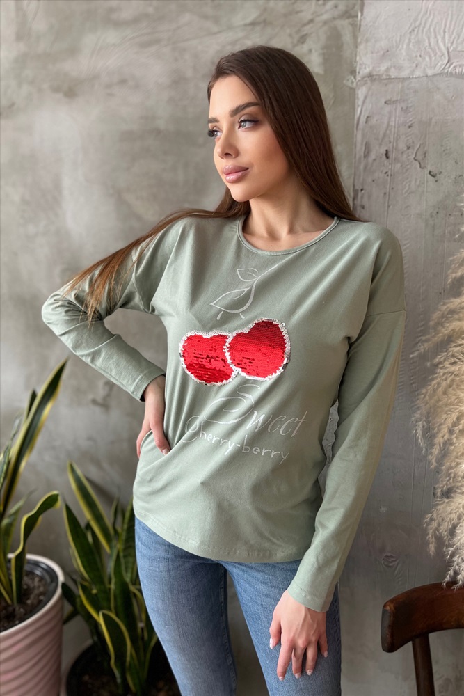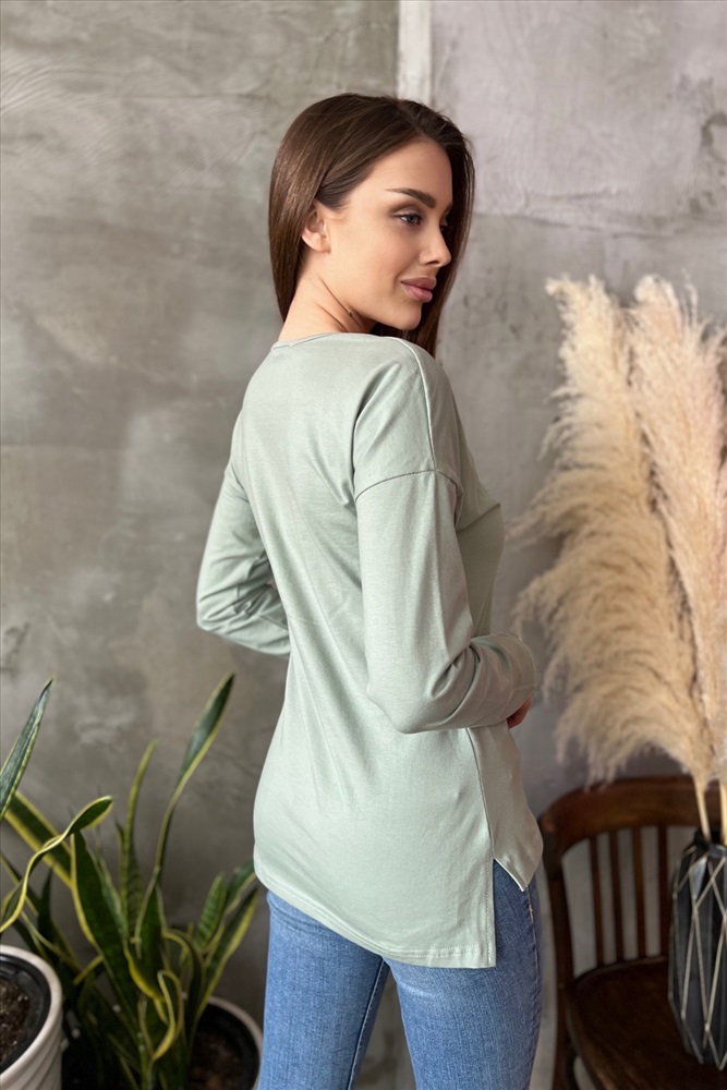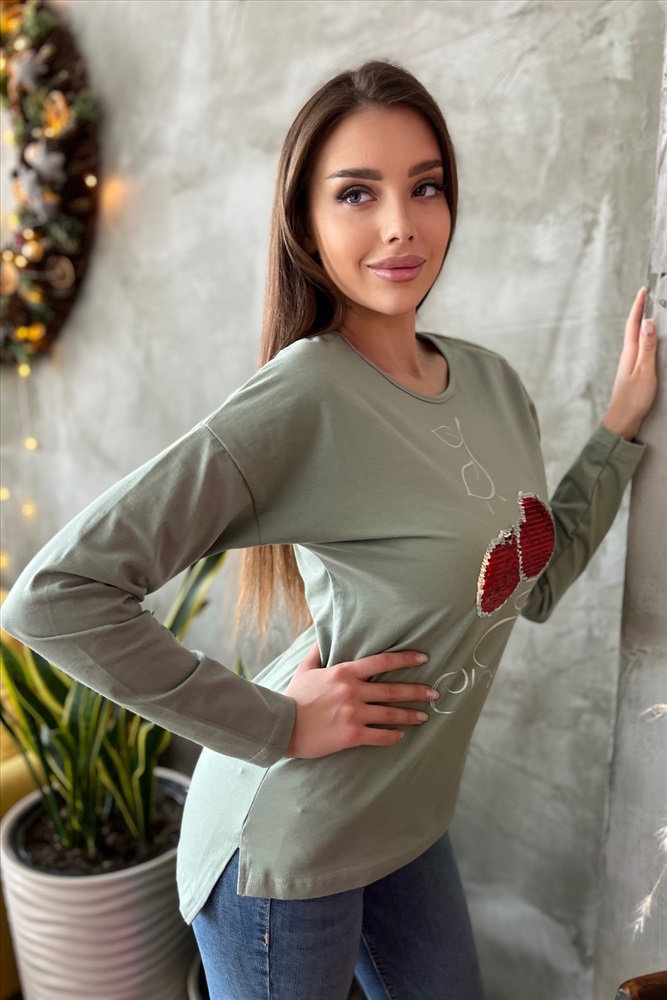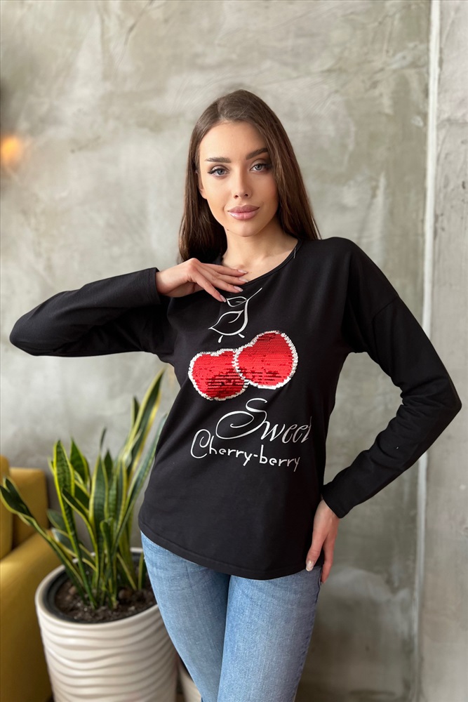 Застежка: без застежки Туника полуприталенного силуэта, с удлиненной спинкой, с округлой горловиной. Рукав длинный. В нижней части боковых швов обработаны разрезы. Горловина обработана бейкой из основного полотна. На полочке эффектная аппликация из пайеток и печать